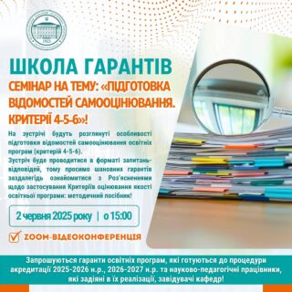 💻👨🏼🏫 Запрошуємо гарантів освітніх програм на черговий семінар ШКОЛИ ГАРАНТІВ «Підготовка відомостей самооцінювання. Критерії 4-5-6»!