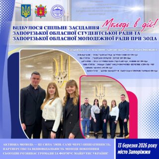 🗓 13 березня 2026 року відбулося спільне засідання Запорізької обласної студентської ради та Запорізької обласної молодіжної ради при ЗОДА. Захід став платформою для обговорення актуальних питань молодіжної політики та розвитку співпраці між молодіжними і студентськими інституціями області.