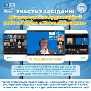 🎓📚13 грудня 2024 року відбулося засідання Міжнародної координаційної робочої групи «Жива спадщина», організоване ЮНЕСКО спільно з Міністерством культури та інформаційної політики України. Під час зустрічі було підбито підсумки реалізації Плану дій за поточний рік, окреслено труднощі у виконанні окремих його пунктів, а також заплановано подальші кроки з урахуванням викликів воєнного стану.