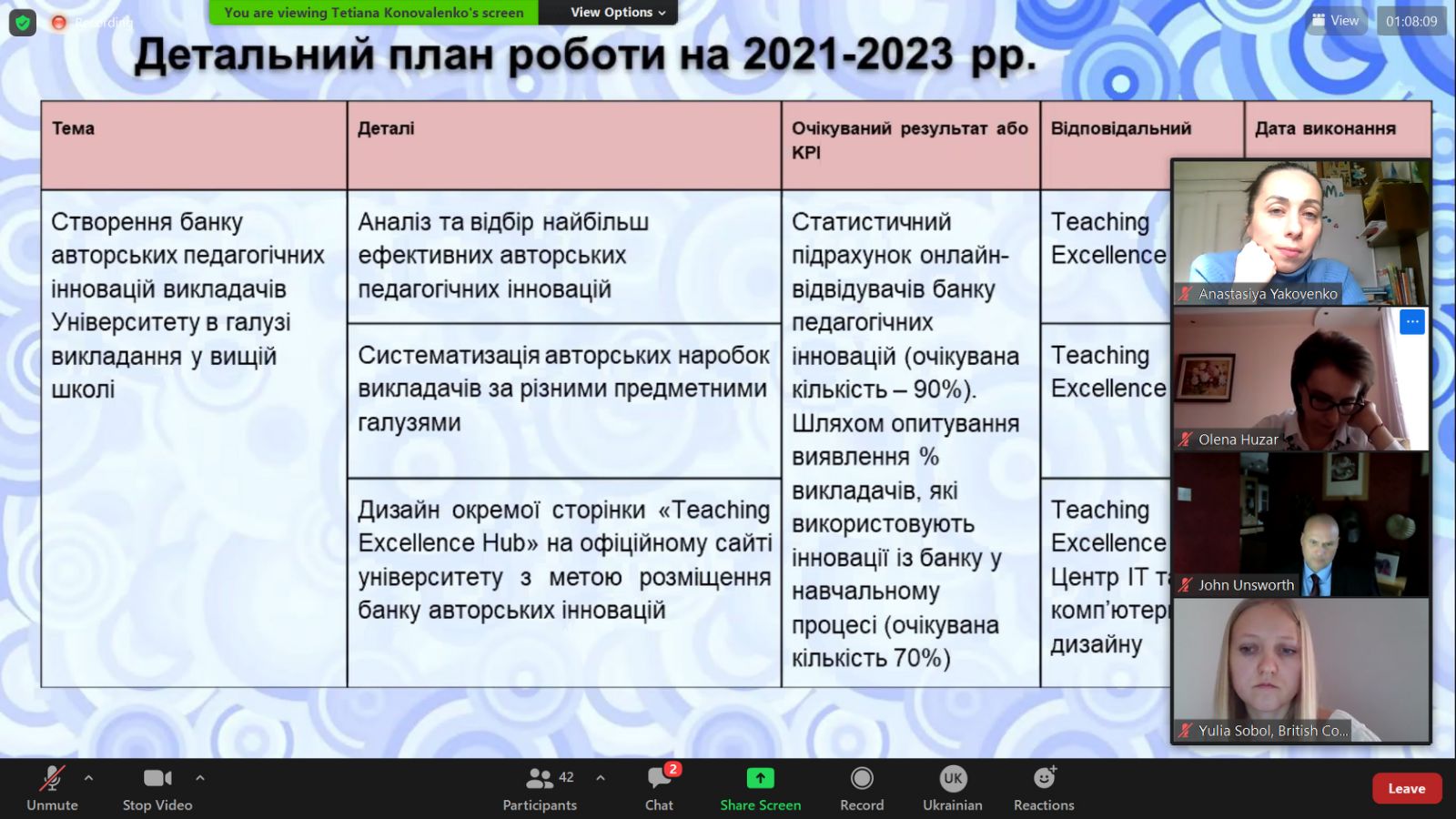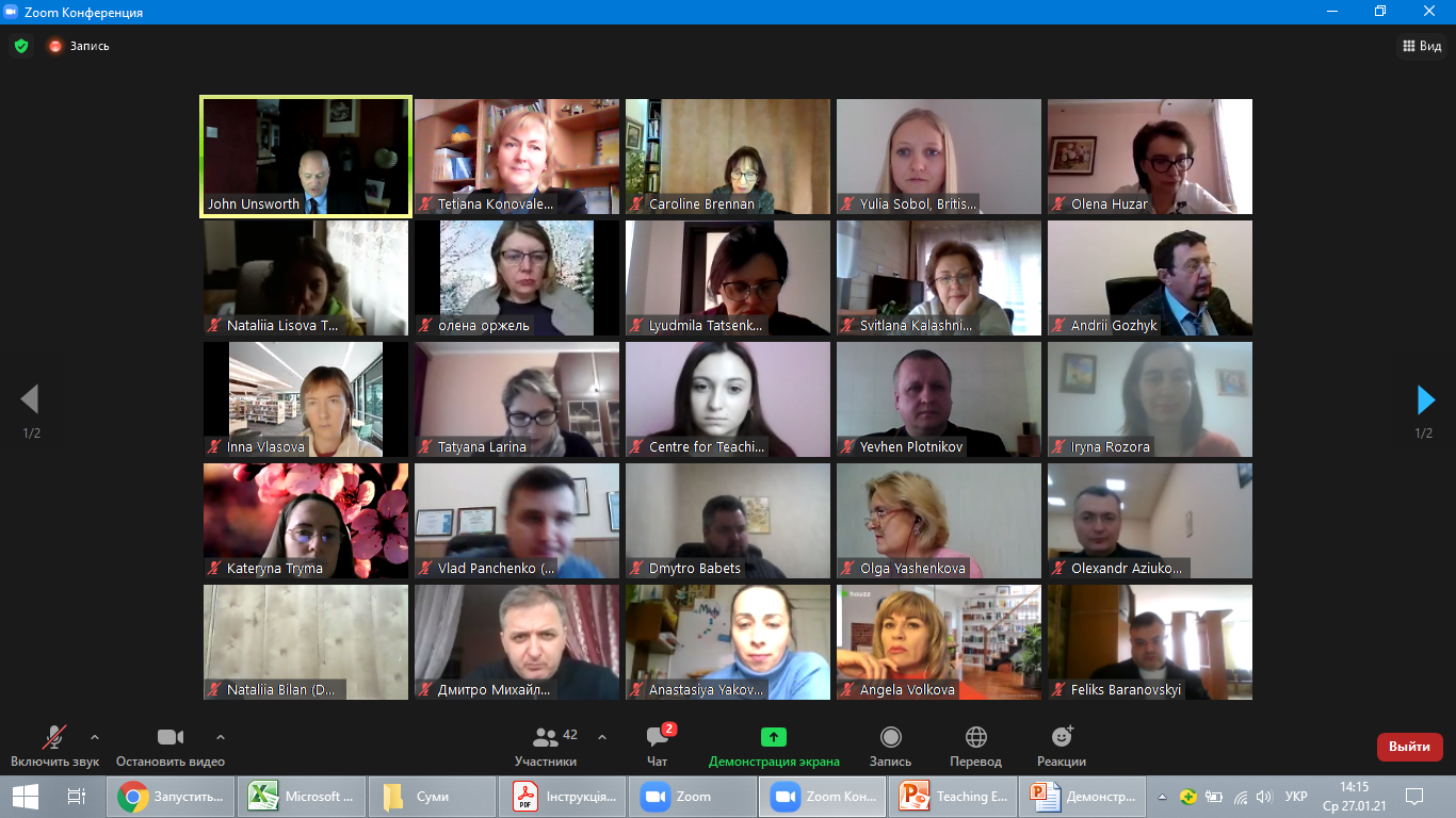 27 січня проектна команда у складі Ольги Гончарової, Тетяни Коноваленко, Анастасії Яковенко разом з головою НМР Наталею Мілько взяли участь у підсумковій зустрічі чергового етапу Міжнародного проєкту Teaching Excellence Programme, який реалізується Британською Радою в Україні у партнерстві з Інститутом вищої освіти НАПН України, Advance HE (Велика Британія) та за підтримки Міністерства освіти і науки України і Національного агентства із забезпечення якості вищої освіти.