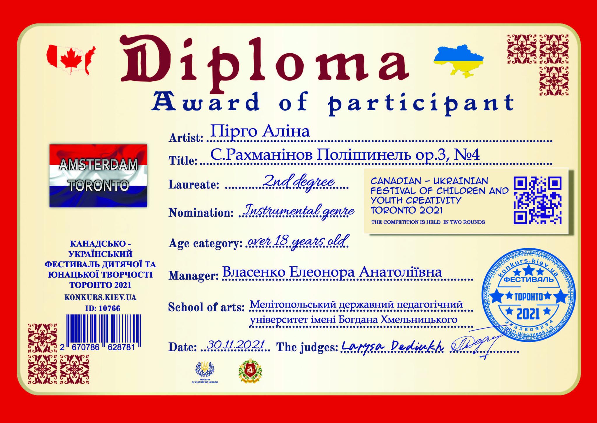 Студенти Навчально-наукового інституту соціально-педагогічної та мистецької освіти стали переможцями на Міжнародному Канадсько-Українському конкурсі-фестивалі дитячої та юнацької творчості «Toronto-Amsterdam 2021» у номінації «Інструментальний жанр».