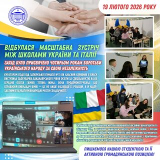 🌍🏛Здобувачка бакалаврського рівня за спеціальністю А4.06 Середня освіта (Хімія) Тетяна ЖИЛА продемонструвала приклад активного студентського лідерства. Як класний керівник 8 класу Запорізька гімназія №51 вона виступила куратором масштабної міжнародної онлайн-зустрічі між школами України та Італії, присвяченої чотирьом рокам боротьби українського народу за незалежність.