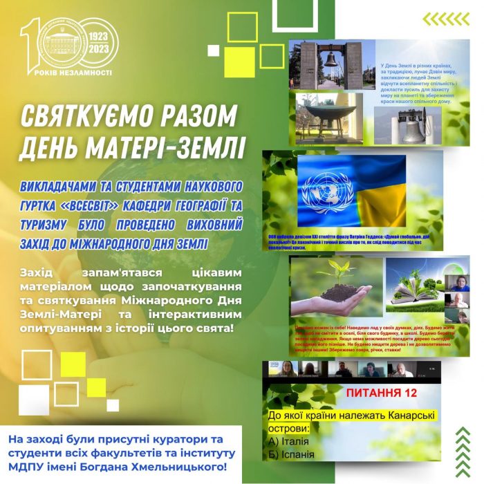 📅🧑🏻‍🎓22 квітня 2024 року викладачами та студентами наукового гуртка «Всесвіт» кафедри географії та туризму було проведено загальноуніверситетський виховний захід до Міжнародного дня Матері-Землі.