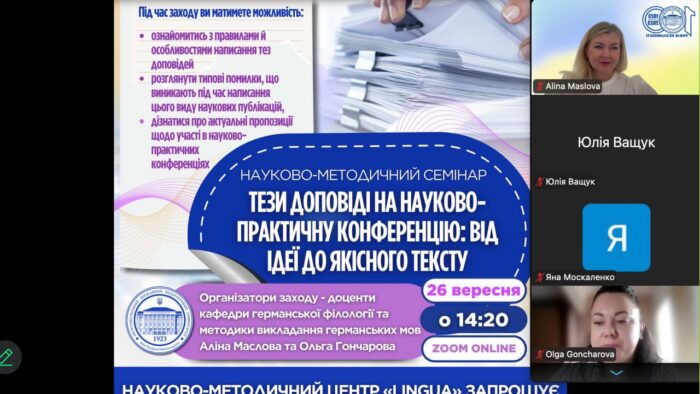 👩🏼🎓‼️Організатори заходу доценти кафедри германської філології та методики викладання германських мов Аліна Маслова та Ольга Гончарова ознайомили присутніх з особливостями написання тез доповіді, звернули увагу на типові помилки, що зустрічаються при написанні, продемонстрували, як вірно оформити список використаних джерел згідно ДСТУ 8302:2015, поділились корисними порадами.