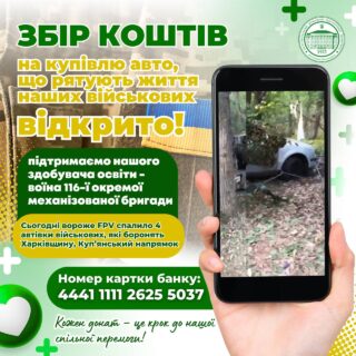 🪖‼️До нас звертається наш незламний здобувач вищої освіти МДПУ імені Богдана Хмельницького — боєць 116-ї окремої механізованої бригади. Сьогодні на Куп’янському напрямку вороже FPV-дрон атакував і знищив чотири автівки наших військових, які захищають Харківщину.