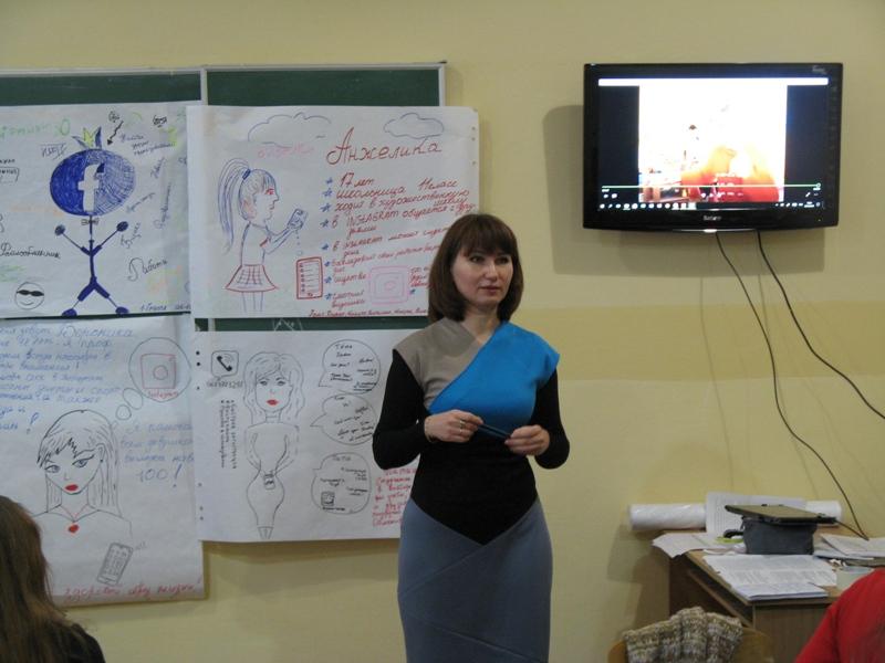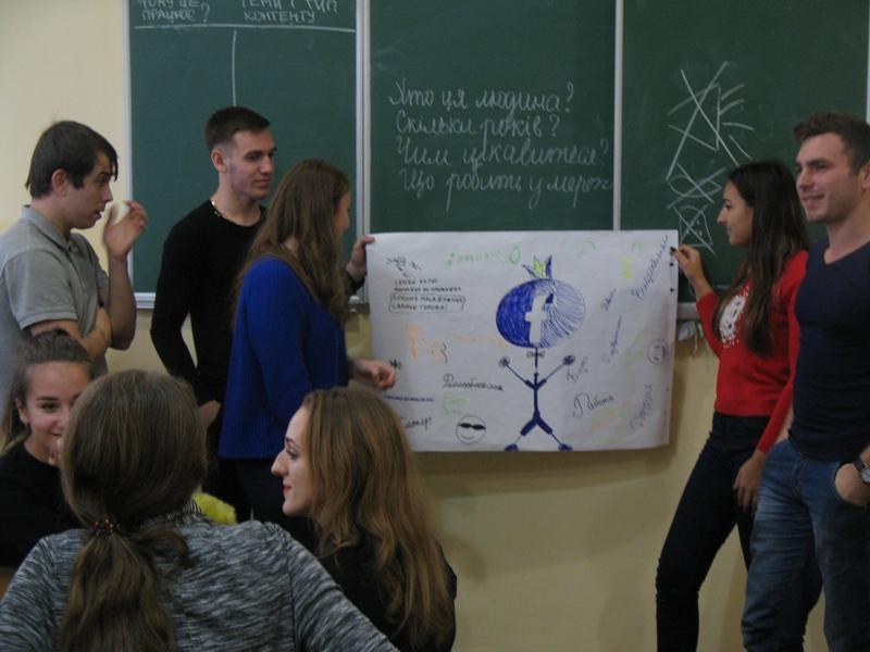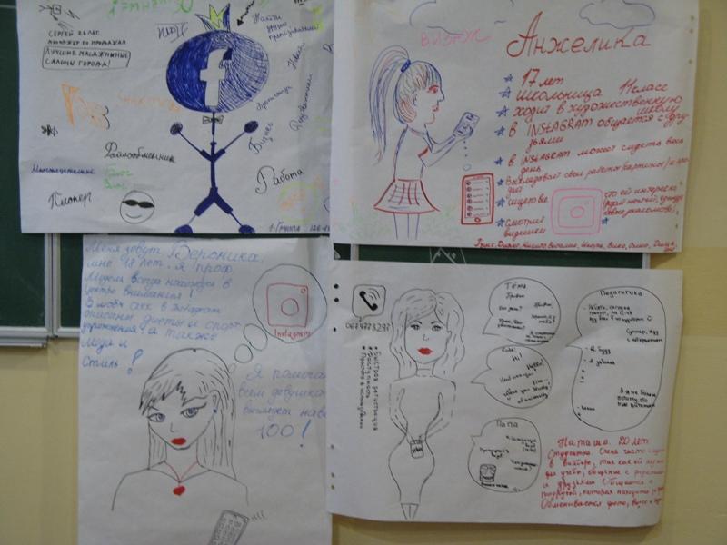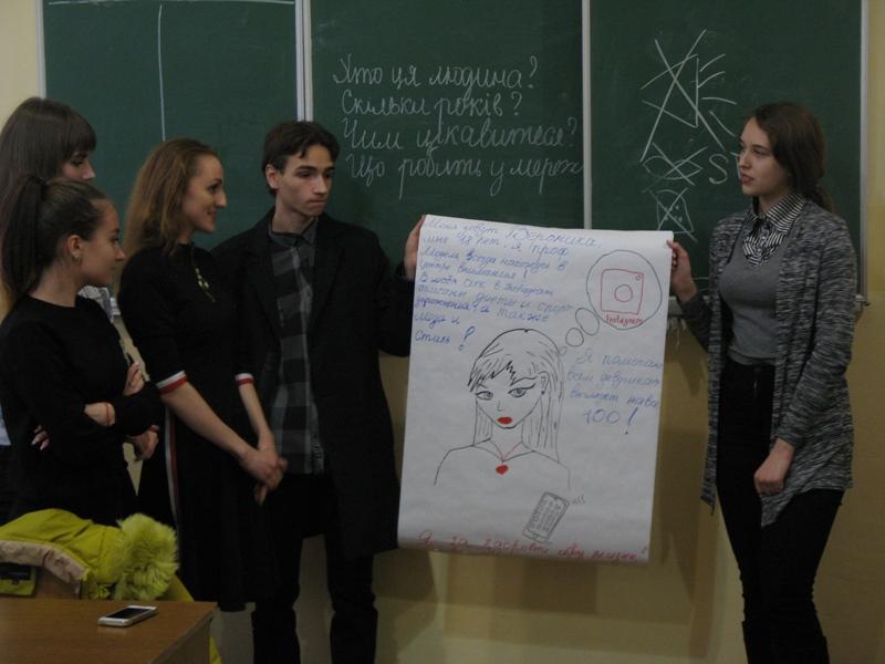 Студентам було запропоновано гру «Створи портрет людини у соціальній мережі». Вийшли дійсно яскраві та креативні роботи. Слід відзначити, що в цьому завданні всі студенти взяли участь, кожен малював, пропонував, писав та коментував, відчував причетність до спільної справи і вболівав за свій проект. Після виконання цієї вправи представлено аналіз кожної соціальної мережі та месенджерів. Багато позицій студенти почули вперше і, навіть, були дуже здивовані.