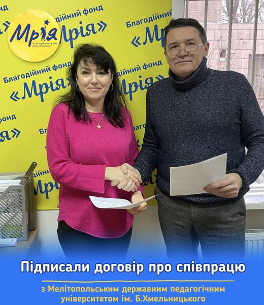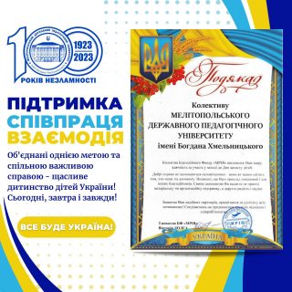 05 березня 2023 р. – Договір про співпрацю між ГО «Мелітопольщина» та МДПУ імені Богдана Хмельницького, який забезпечуватиме здійснення благодійної діяльності, спрямованої на задоволення потреб вразливих категорій громадян, що опинилися в скрутному становищі через російську агресію проти України; спрямування своїх спільних зусиль на забезпечення громадян різного віку освітніми, консультаційними та іншими послугами згідно зі статутними напрямками діяльності; проведення різноманітних заходів, спрямованих на організацію дозвілля та різносторонній розвиток дітей та дорослих, що у свою чергу сприятиме успішній соціалізації особистості та адаптації в суспільстві.