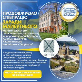 22 травня 2023 р. – укладено Договір про співпрацю між Національним заповідником «Хортиця» та МДПУ імені Богдана Хмельницького. Договір передбачає охорону й управляння біорізноманіттям на об’єктах природно-заповідного фонду; наукове визначення лімітів на використання природних ресурсів загальнодержавного значення; розробку проєктів утримання й реконструкції садово-паркових об’єктів «Хортицький лабіринт» та «Дендропарк»; екологічну освіту.
