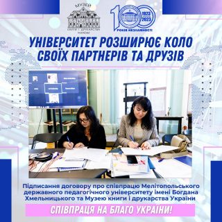 25 листопада 2023 р. – підписано Договір між Музеєм книги і друкарства України та МДПУ імені Богдана Хмельницького. Серед головних напрямів співпраці: проведення спільних науково-практичних та науково-методичних заходів, обмін науковою літературою, надання змоги науково-педагогічним, педагогічним, науковим працівникам публікувати спільні наукові статті про результати спільної науково-дослідницької діяльності в журналах і наукових виданнях; підготовка та видання монографій, наукових видань; проходження практик здобувачами вищої освіти; спільна участь у міжнародних академічних програмах; виконання спільної науково-дослідницької роботи в межах міжнародних грантів, а також участь у науково-технічних і науково-дослідних проєктах міжнародного та регіонального рівнів.