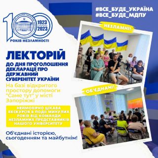 17 липня 2023 р. на базі Відкритого простору допомоги «Саме тут» у місті Запоріжжі відбувся лекторій до Дня проголошення Декларації про державний суверенітет України. Команда МДПУ імені Богдана Хмельницького підготувала цікаву екскурсію в події минулих років, розповіла про історію створення цього важливого документа, що передбачає верховенство, самостійність, повноту й неподільність влади в межах території України та незалежність України в зовнішніх відносинах. Учасники зустрічі наголосили, що Україна – суверенна, незалежна, демократична, правова держава. Так було, є і буде!