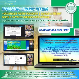 🎓📚Так, 28 листопада 2024 року в рамках викладання курсу «Психологічна служба» було проведено бінарну лекцію «Організація роботи психолога в закладі середньої освіти в структурі психологічної служби».