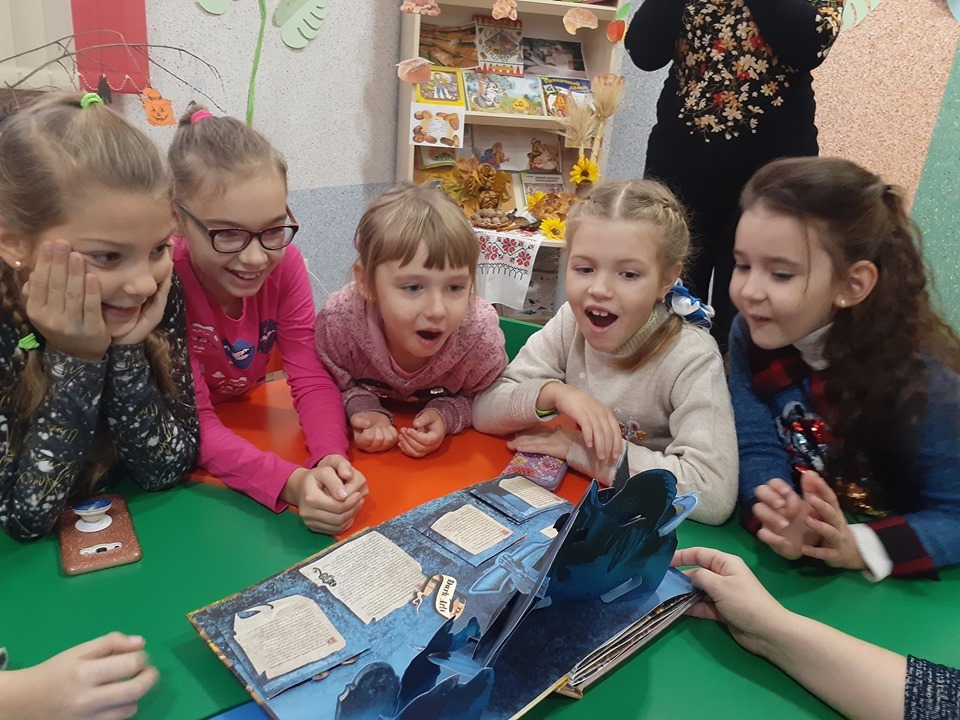 Завдяки цьому, без перебільшення, щасливому збігу обставин, ми потрапили на гостину до наших щирих друзів. Певна річ, що перебувати у стінах бібліотеки і не згадати про книги — це було б неприпустимим, тож не дивно, що наша зустріч із читачами бібліотеки розпочалася саме з обговорення книги. От тільки книга зруйнувала усі стереотипи про книги, адже це, як з’ясували для себе маленькі читачі,  була об’ємна pop-up- книга, або як ще називають такі книги – книга з живими сторінками «Harry Potter».  Захвату і подиву маленьких читачів не було меж. Вони знову і знову поверталися до об’ємних ілюстрацій, упізнавали героїв, і настільки захопилися, що  на останніх сторінках і розворотах  вже  «запідозрювали» об’ємні елементи навіть там, де їх не було.