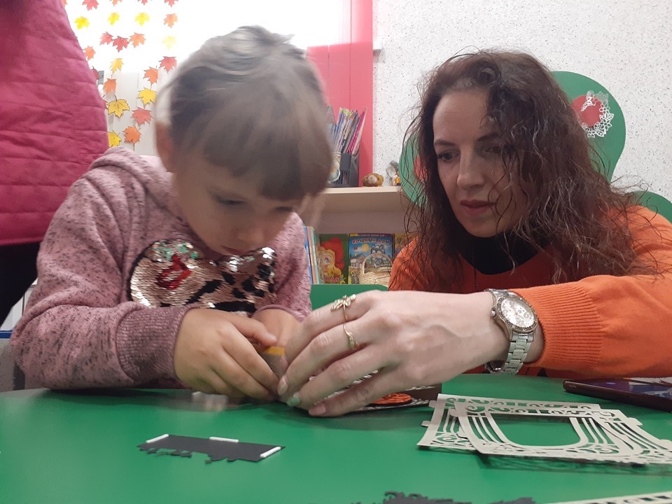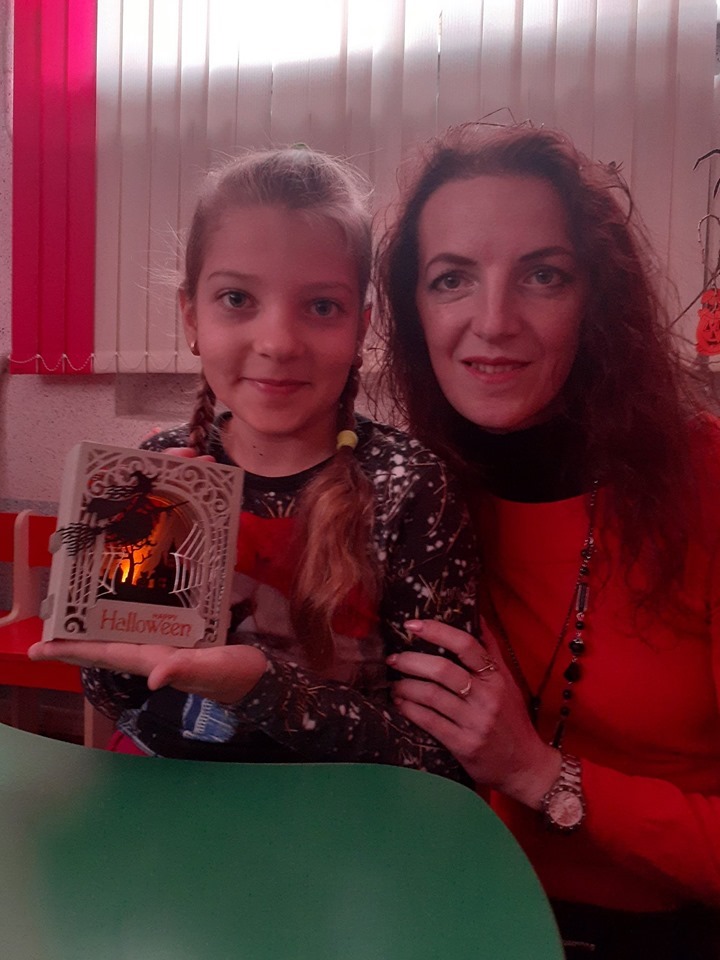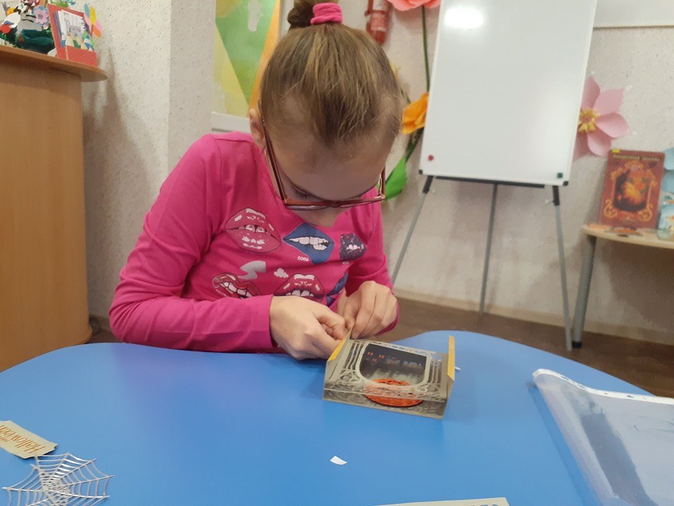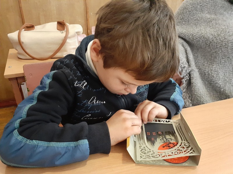 Надихнувшись від перегляду книги,  маленькі читачі перейшли до власне виготовлення об’ємної 3D-листівки-трансформера «Happy Halloween». І робота закипіла, та ще й така, що й дорослі, спостерігаючи це захопливе дійство,  і собі не втрималися і долучилися до цікавого дозвілля.  Утім, усі, хто виготовляли листівку, мабуть, дружно б заперечили: «Про яке дозвілля йдеться?! Ні, праця і дуже відповідальна праця!» І мабуть, теж би мали рацію. Адже, хоча за виготовлення листівки не було використано жодної краплі клею — його замінив професійний дизайнерський двосторонній скотч — зметикувати, у якій послідовності поєднувати деталі листівки, без уважності і старанності у своїх діях було не обійтися. Ось так і проходив цей майстер-клас, під покровом її Величності Творчості, яка полонила усіх без винятку — і допитливих дітей і доброзичливих дорослих, professionals and newbies.