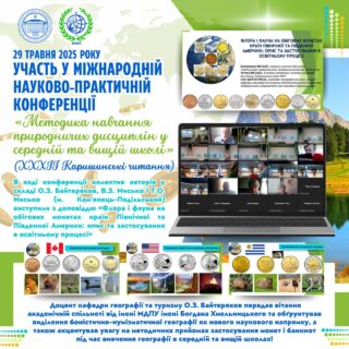 👨🏼‍🎓📚29 травня 2025 року доцент кафедри географії та туризму О. З. Байтеряков взяв участь у Міжнародній науково-практичній конференції «Методика навчання природничих дисциплін у середній та вищій школі» (XXХIІ Каришинські читання), що проводилась у змішаному форматі на базі Полтавського національного педагогічного університету імені В.Г. Короленка.