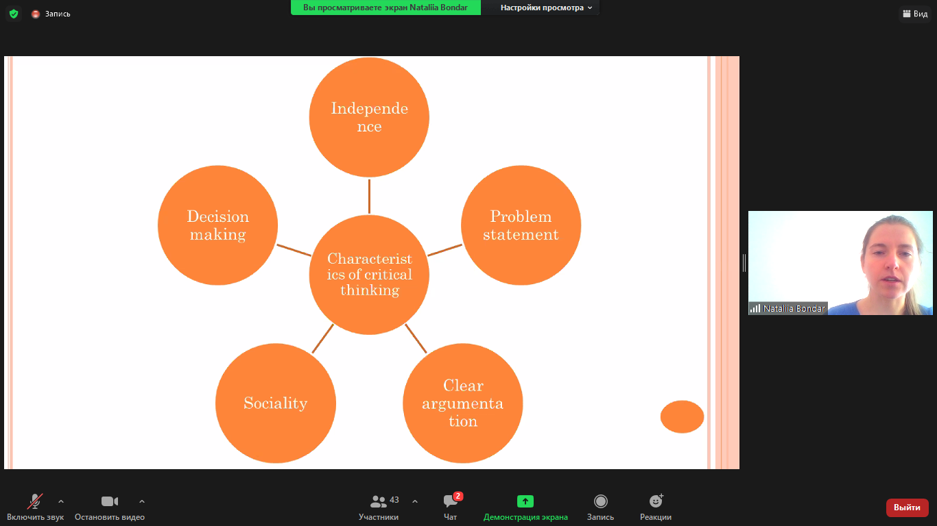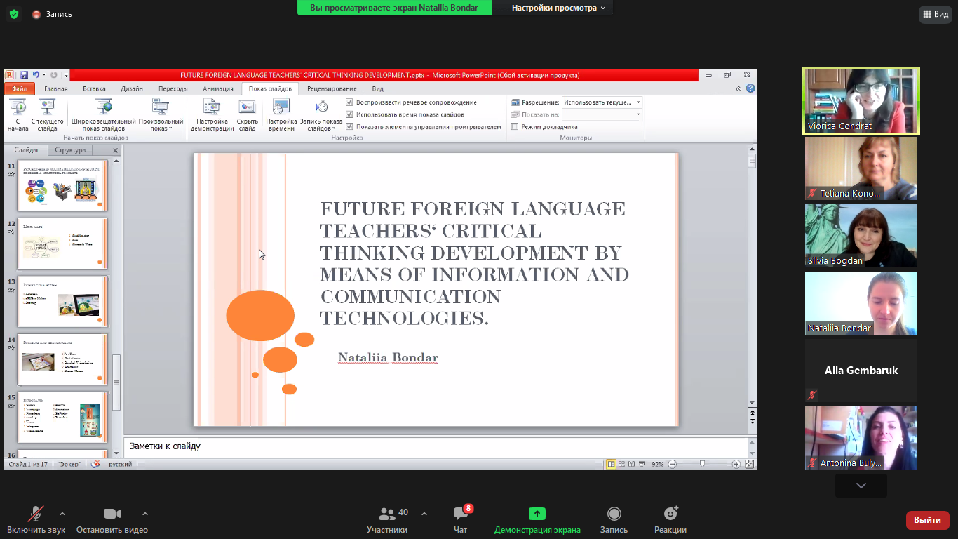 Здобувачка першого року Наталя Бондар представила свої напрацювання за темою свого дослідження у доповіді «Future foreign language teachers’ critical thinking development by means of information and communication technologies». Зважаючи на актуальність дослідження доповідь викликала жваве обговорення і численні питання.