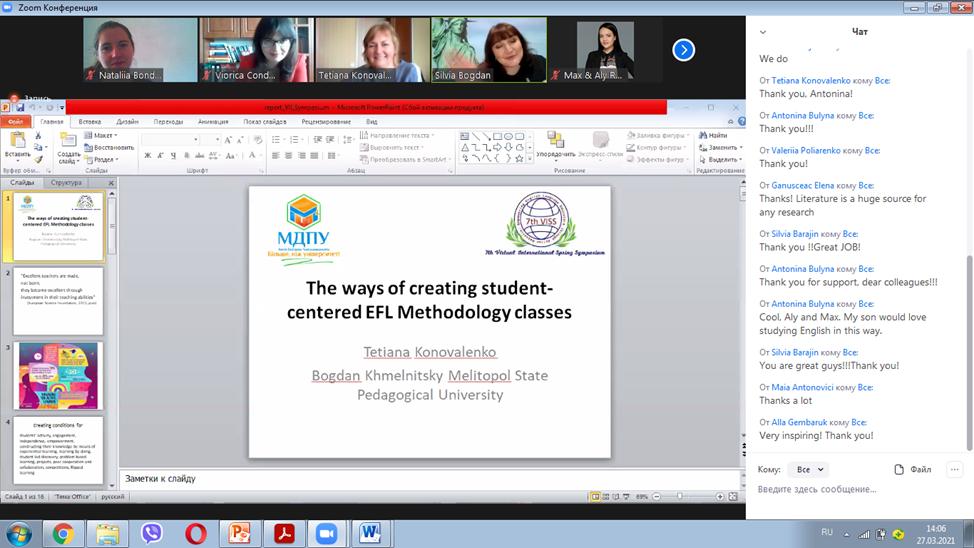 Тетяна Коноваленко присвятила свою доповідь «The ways of creating student-centered EFL methodology classes» питанням створення студентоцентрованого освітнього середовища у закладі вищої освіти. Виступ ґрунтувався на досвіді, отриманому у міжнародних проектах, та позитивних практиках нашого університету щодо модернізації вищої освіти.