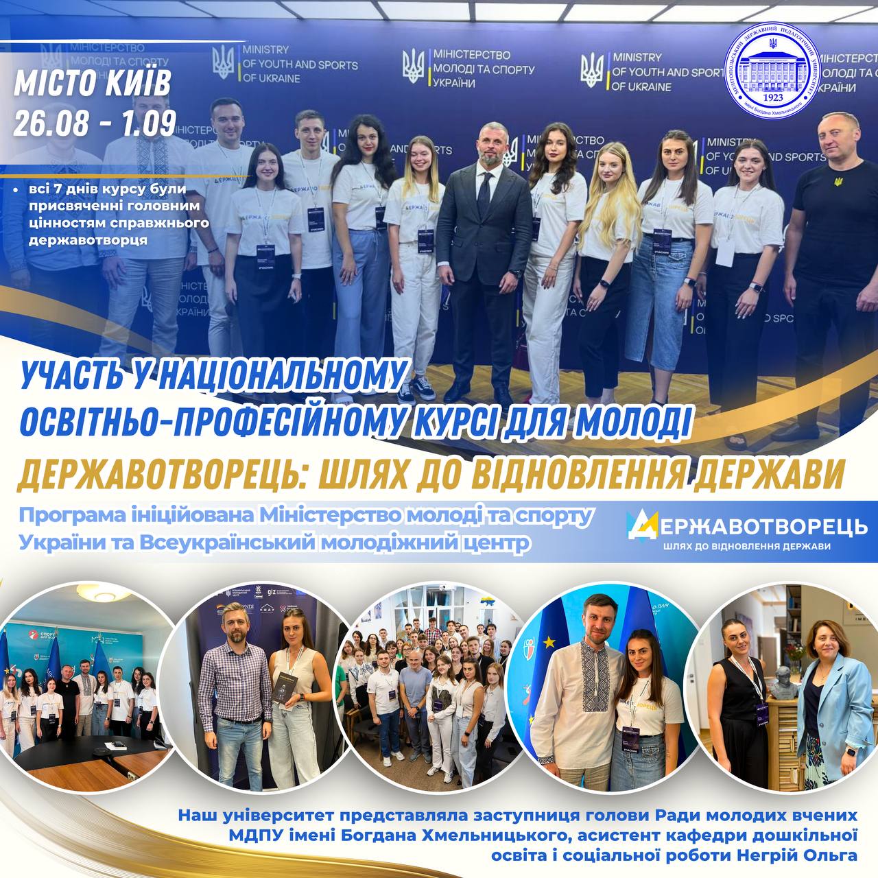 🙋🏻♀️💫Заступниця голови Ради молодих вчених МДПУ імені Богдана Хмельницького, асистент кафедри дошкільної освіти і соціальної роботи Негрій Ольга взяла участь у національному освітньо-професійному курсі для молоді «Державотворець: шлях до відновлення держави»