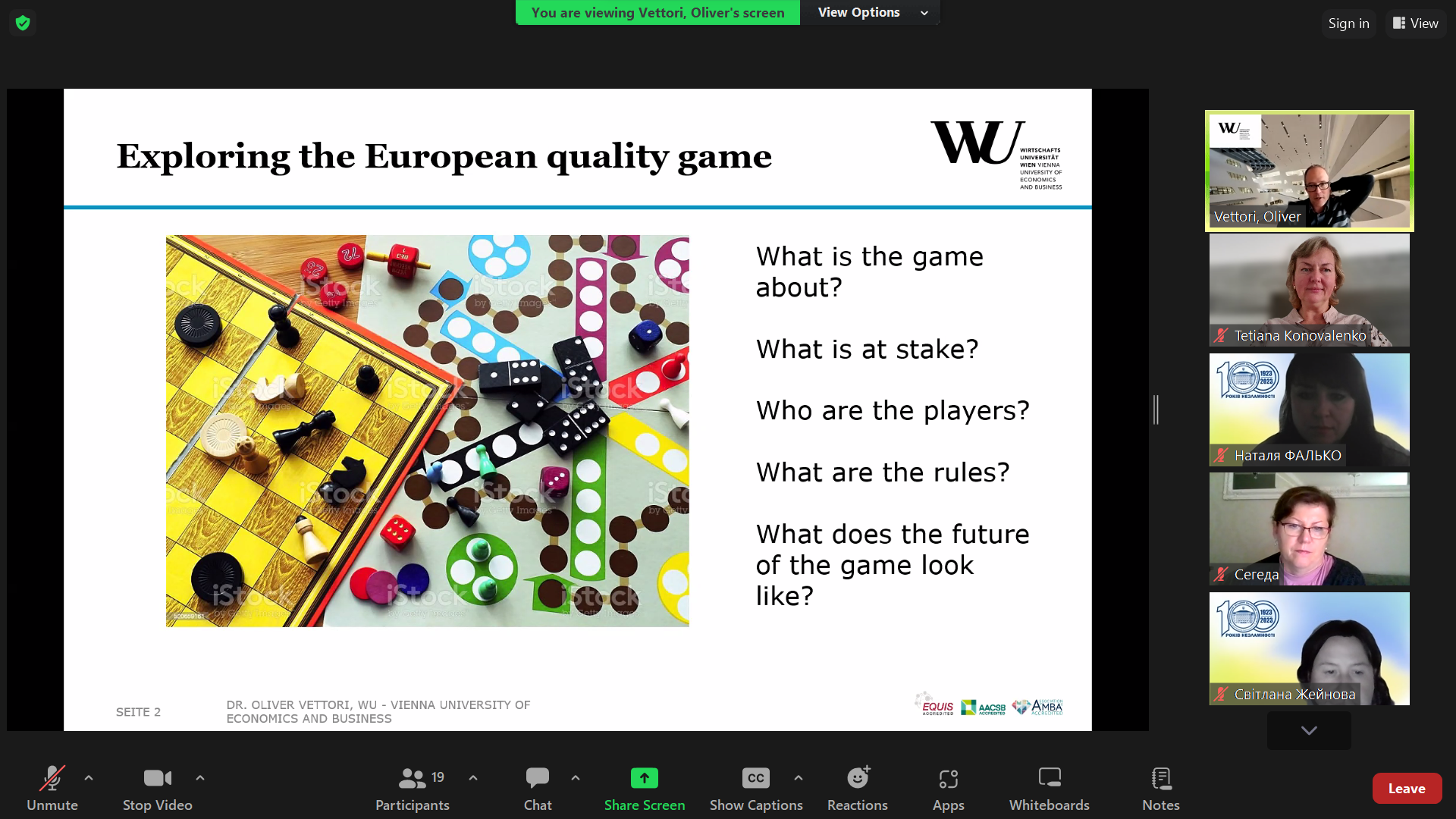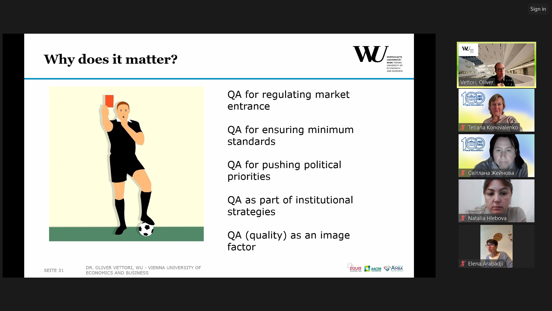 Експертами для нашого університету стали Ірма Грдзелідзе, доцентка факультету психології та педагогічних наук Тбіліського державного університету, керівниця Служби забезпечення якості Тбіліського державного університету (2018-2023), директорка департаменту стратегічного розвитку та міжнародної акредитації; членкиня комітету Євразійської асоціації дослідників вищої освіти, експертка з реформування вищої освіти Erasmus+, EACEA (2015-2021), експертка з акредитації та авторизації вищої та професійно-технічної освіти в Національному центрі підвищення якості освіти Грузії у 2014-2019 роках, та Олівер Ветторі, декан з акредитації та управління якістю Віденського університету економіки та бізнесу, експерт у 15 міжнародних агенціях із забезпечення якості освіти, експерт ENQA з 2016 р., член редколегії “Quality in Higher Education”, завідувач ради з якості ENGAGE.EU, дослідник питань забезпечення якості вищої освіти.