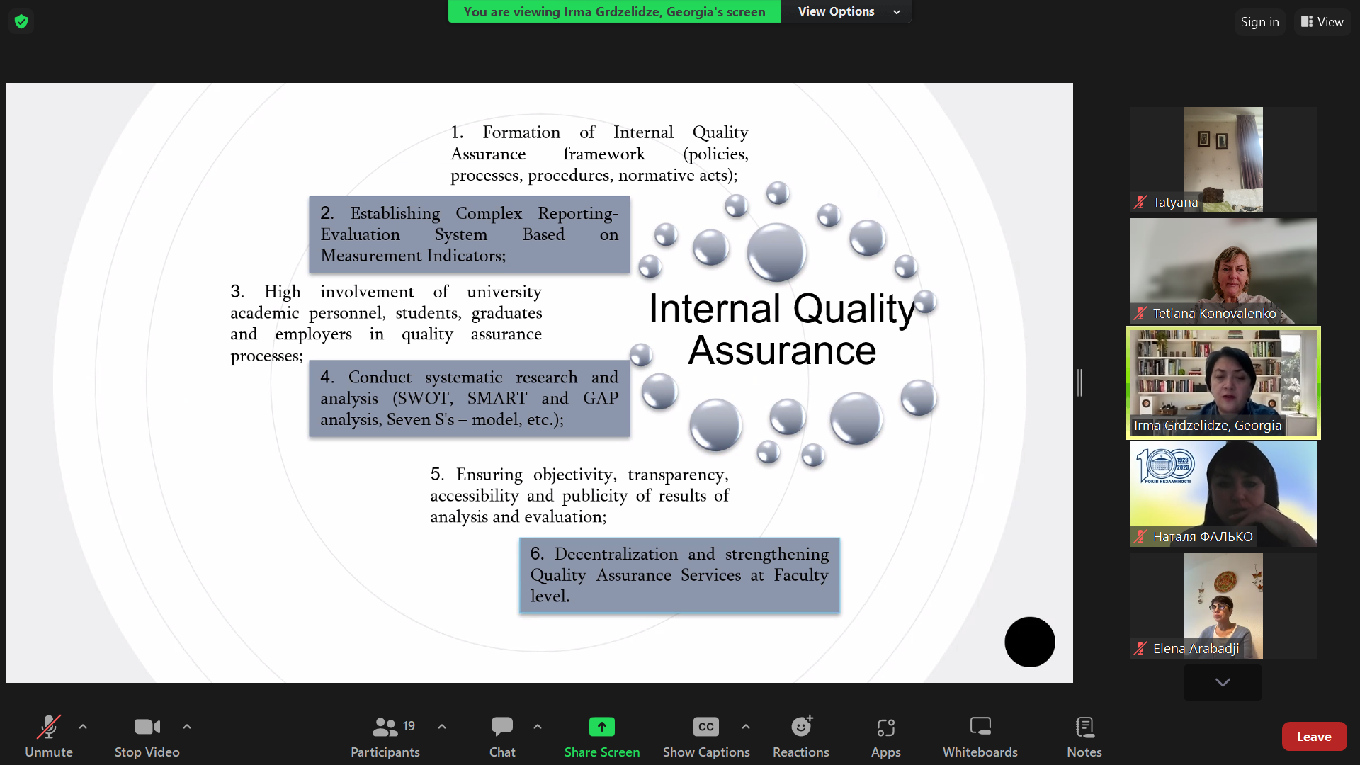 Програма зустрічі передбачала презентацію університету та відвідування воркшопів. У перший день зустрічі учасники мали змогу прослухати презентацію Олівера Ветторі «Європейська гра якості»: гравці, правила, цінність» та відвідати воркшоп Ірми Грдзелідзе «Системи інституційного забезпечення якості освіти у рамках європейського простору вищої освіти». Зокрема, було розглянуто такі поняття як: якість, забезпечення якості, контроль якості та культура якості, а також різні підходи, інструменти та механізми забезпечення якості вищої освіти. Було охарактеризовано складові внутрішнього та зовнішнього забезпечення якості освіти. Так, важливими складовими внутрішнього забезпечення якості є: формування внутрішньої системи забезпечення якості, активне залучення академічних працівників, здобувачів, випускників та роботодавців в освітні процеси, проведення систематичних досліджень та аналізу, забезпечення об’єктивності, доступності та публічності результатів аналізу та оцінки, децентралізація та посилення служб забезпечення якості на рівні факультету. Практичну реалізацію забезпечення якості освіти було розглянуто на прикладі Тбіліського державного університету.