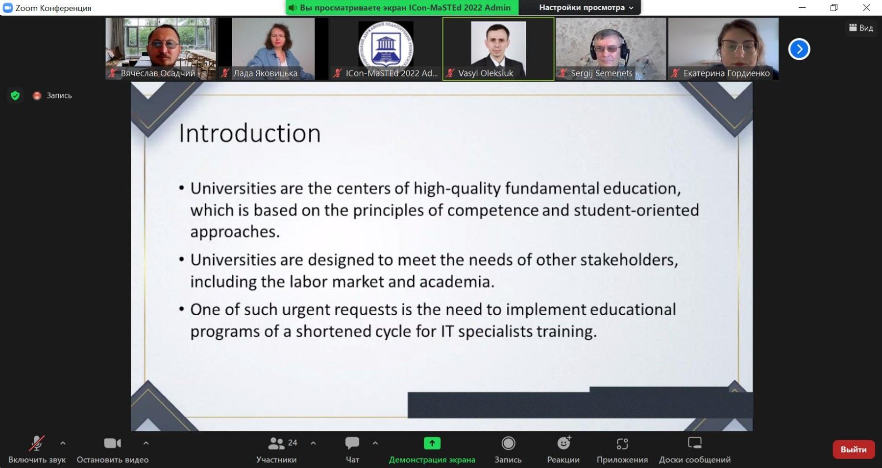 19.05.2022 в межах секції «Computer Science and Computer Science Education» було представлено доповіді за участі професора Вячеслава Осадчого «Review of state of computer vision technologies development in the world and Ukraine» у співавторстві з Наталею Валько (Херсонський державний університет) та «Mathematical model of the base unit of the biotechnical system as a type of edge devices» у співавторстві з науковцями Житомирської політехніки та ADA University (Азербайджан).