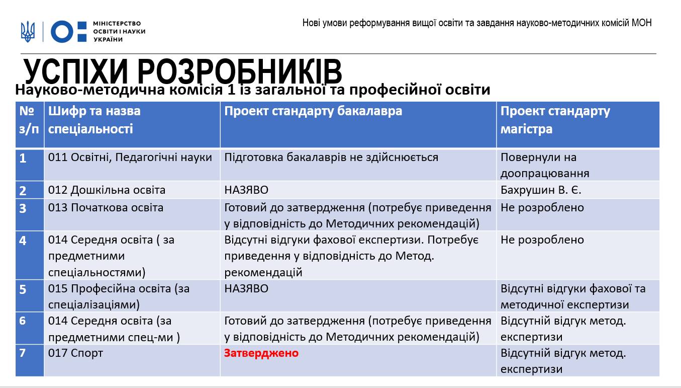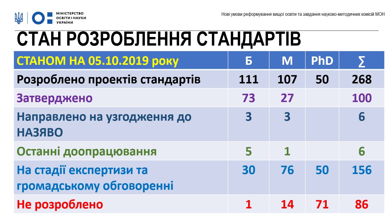 Станом на 05.09.2019 р. розроблено проектів стандартів: 111 (бакалавр),107 (магістр), 50 (PhD); затверджено стандартів: 73 (бакалавр), 27 (магістр), – (PhD).