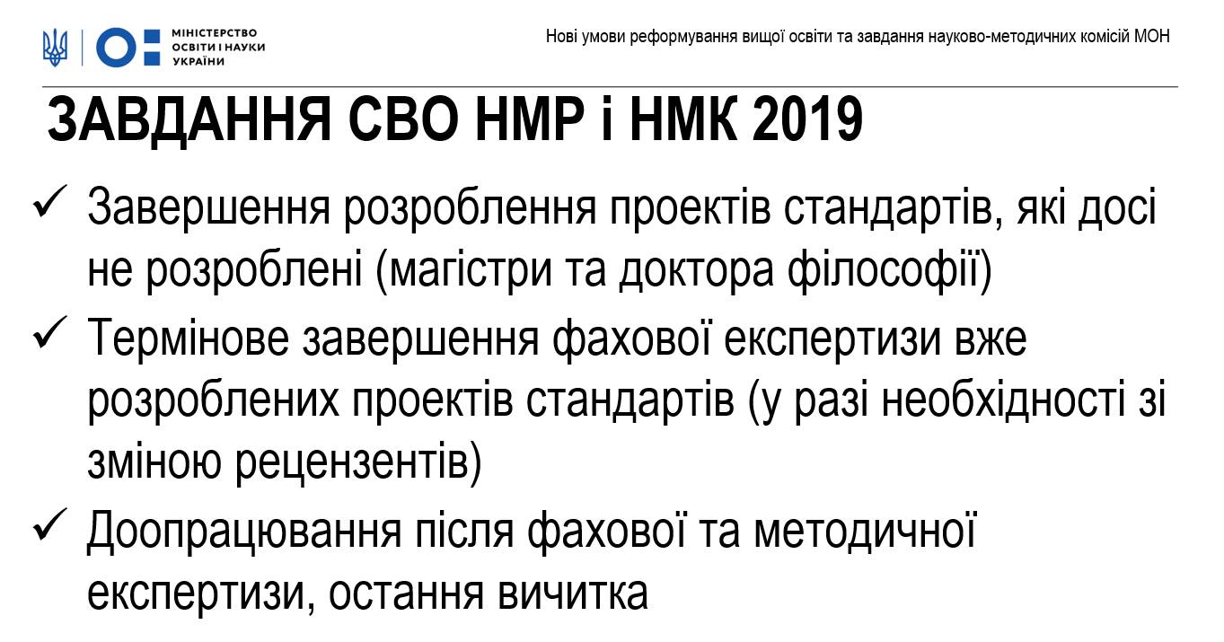 – Завершення розроблення лінійки стандартів вищої освіти (усі ступені), їх вдосконалення;