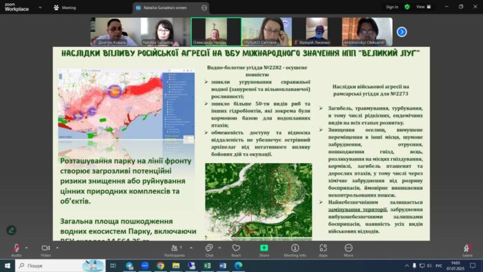✅📝 «Наслідки російської агресії для водно-болотних угідь міжнародного значення Національного природного парку «Великий Луг», зокрема Рамсарських угідь «Архіпелаг Великі і Малі Кучугури» та «Заплава Сім Маяків» (к. б. н., доц., зав каф. екології та інформаційних технологій МІЕСТ УУ, н. с. НПП «Великий Луг» – Сурядна Н.М.);