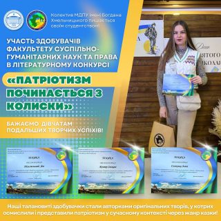 🇺🇦👩🏼🎓Серед нагороджених – здобувачки факультету суспільно-гуманітарних наук та права спеціальності 014.01 Середня освіта (Українська мова і література) за освітньою програмою Середня освіта. Українська мова і література. Англійська мова і література – Сніжана Жовнір (група 212-сг), Яна Толстеньова (група 211-сг) та Аліна Єложенко (група М214-сг), які стали авторками оригінальних творів, у котрих осмислили і представили патріотизм у сучасному контексті через жанр казки.