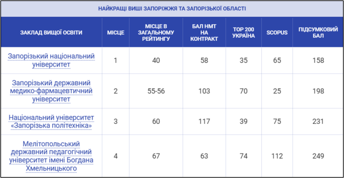 У підрейтингу закладів вищої освіти Запоріжжя та Запорізької області Університет у 2024 році посів 4 місце Рейтинг закладів вищої освіти Запоріжжя – Освіта.UA (osvita.ua) (Рис. 3). Таке ж місце він посідав і у 2023 році.