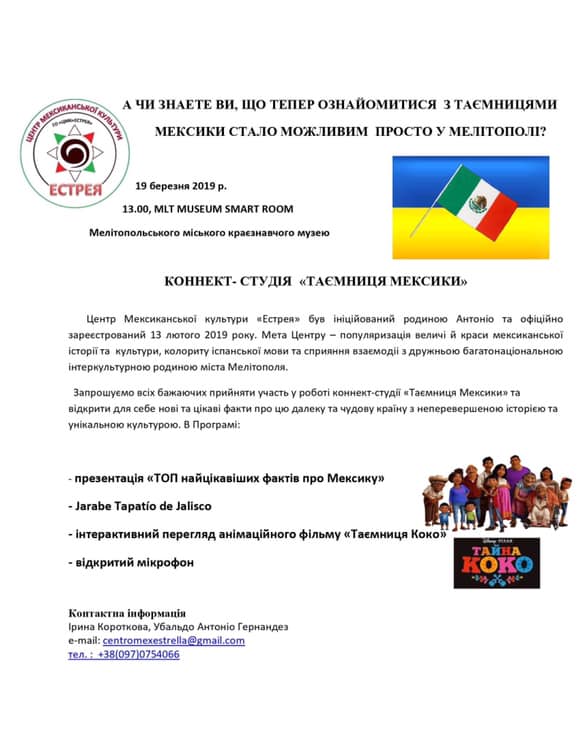 19 березня о 13.00 в Мелітопольський краєзнавчий музей / Melitopol’ Museum Of Local Lore відбулася коннект-студія «Таємниця Мексики» від Центр мексиканської культури «Естрея» міста Мелітополя.