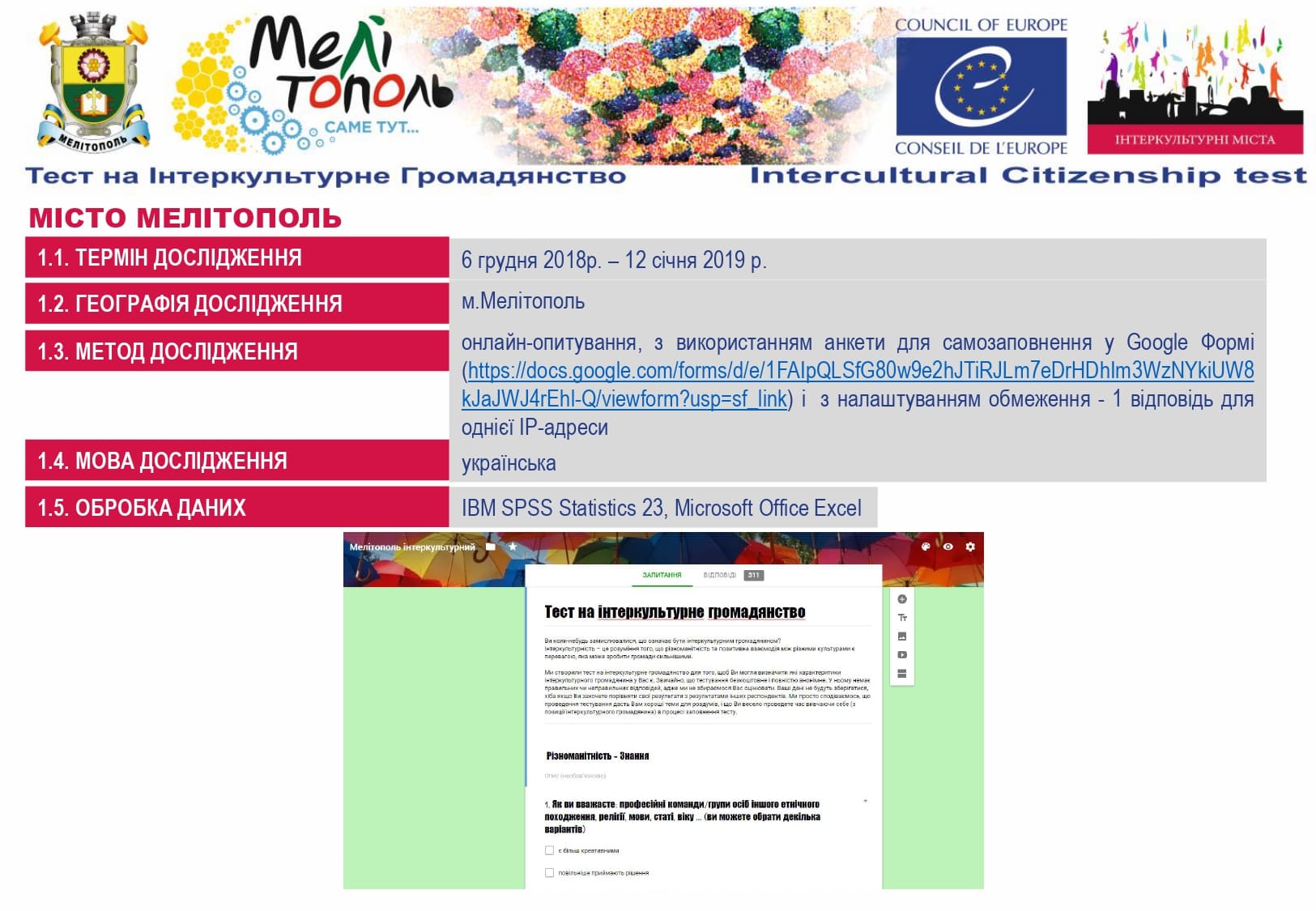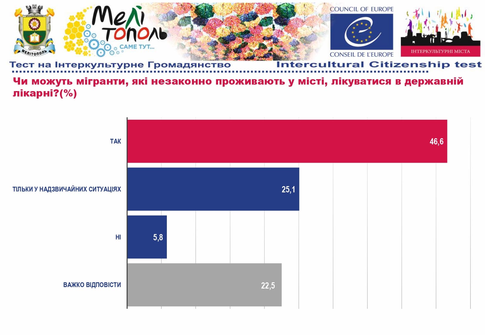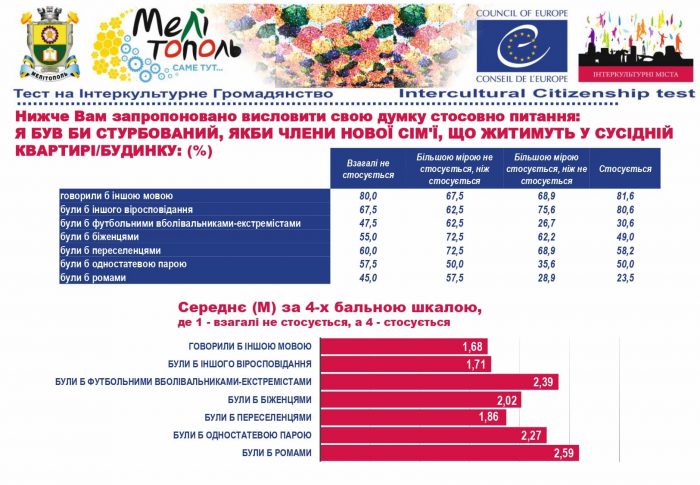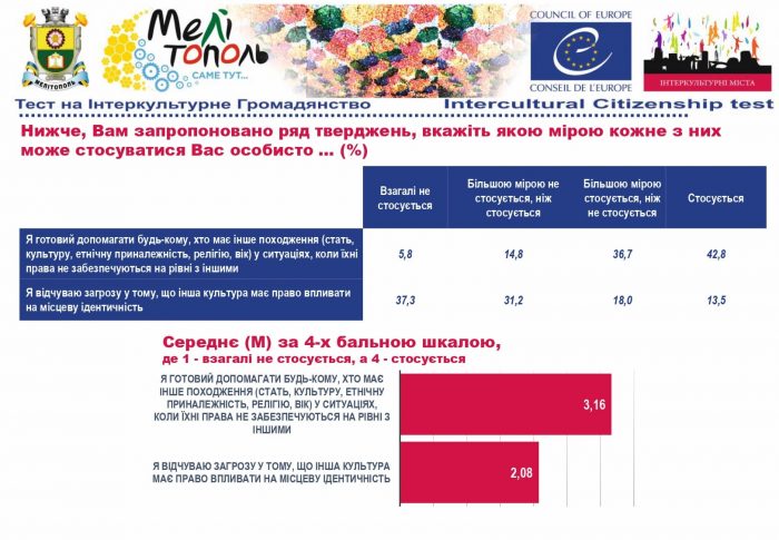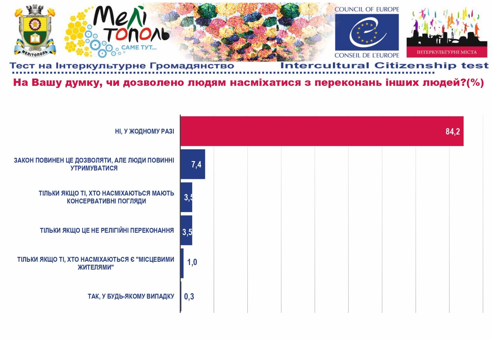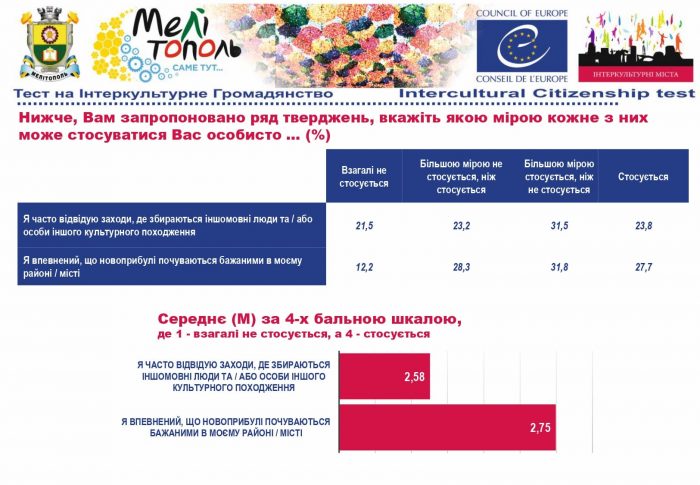 У рамках реалізації проєкту «Боротьба з чутками» за підтримки Програми «Інтеркультурні Міста» (ІСС) Ради Європи (РЄ), за методикою експерта з ІСС політики РЄ Др. Ксенії Рубікондо й у співпраці з Центром соціологічних досліджень Мелітопольського державного педагогічного університету, з 11 червня по 2 липня 2021 року, проводилося опитування жителів учасників Української Мережі Інтеркультурних Міст (ІСС-Україна) – Вінниця, Луцьк, Мелітополь, Павлоград, Одеса, Суми – з ціллю класифікації існуючих чуток та упереджень, що стосуються культурного різноманіття.