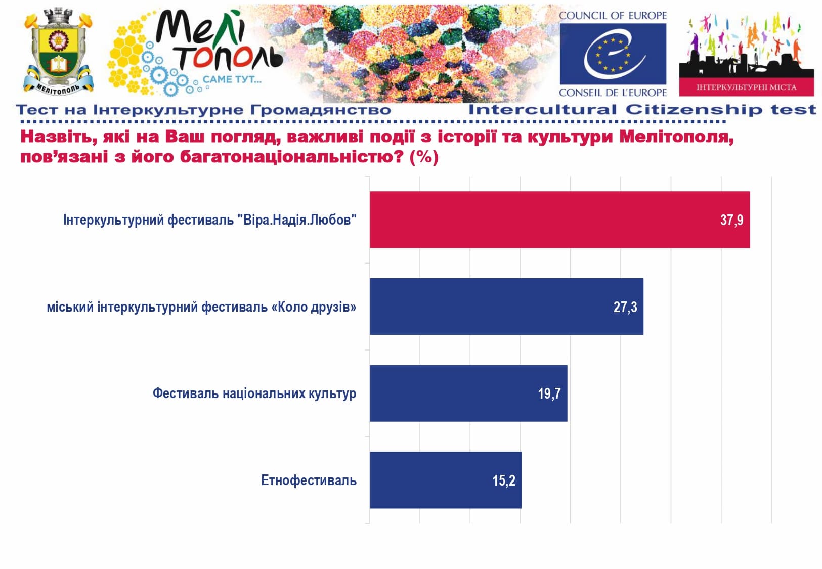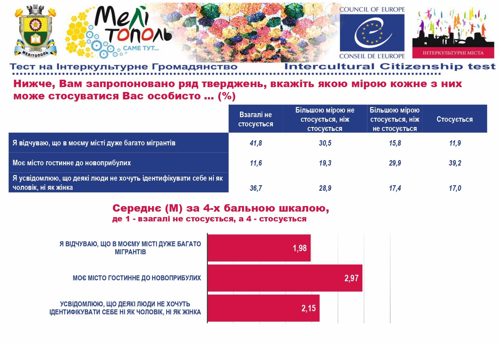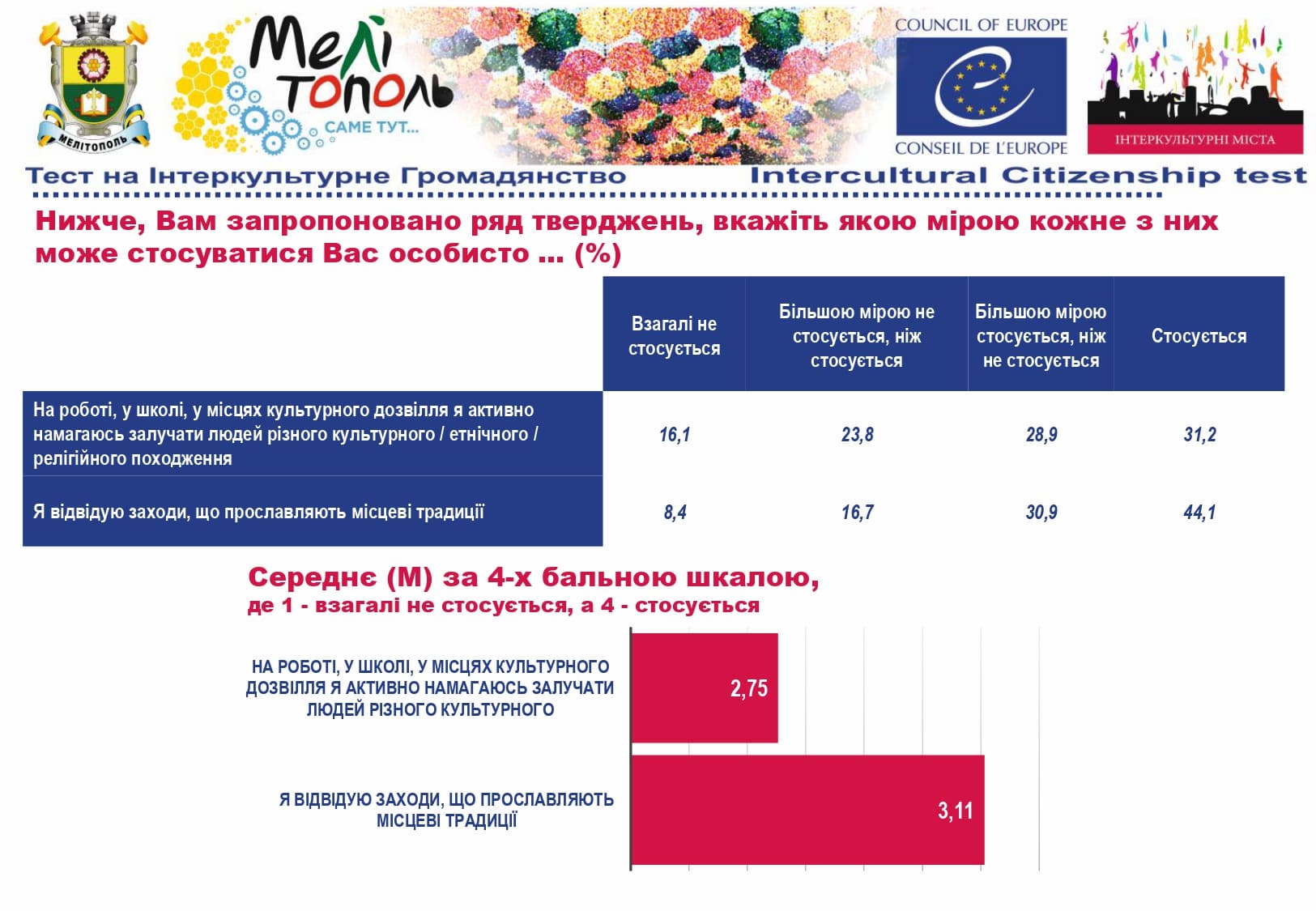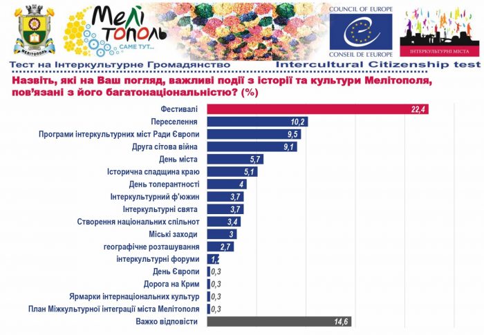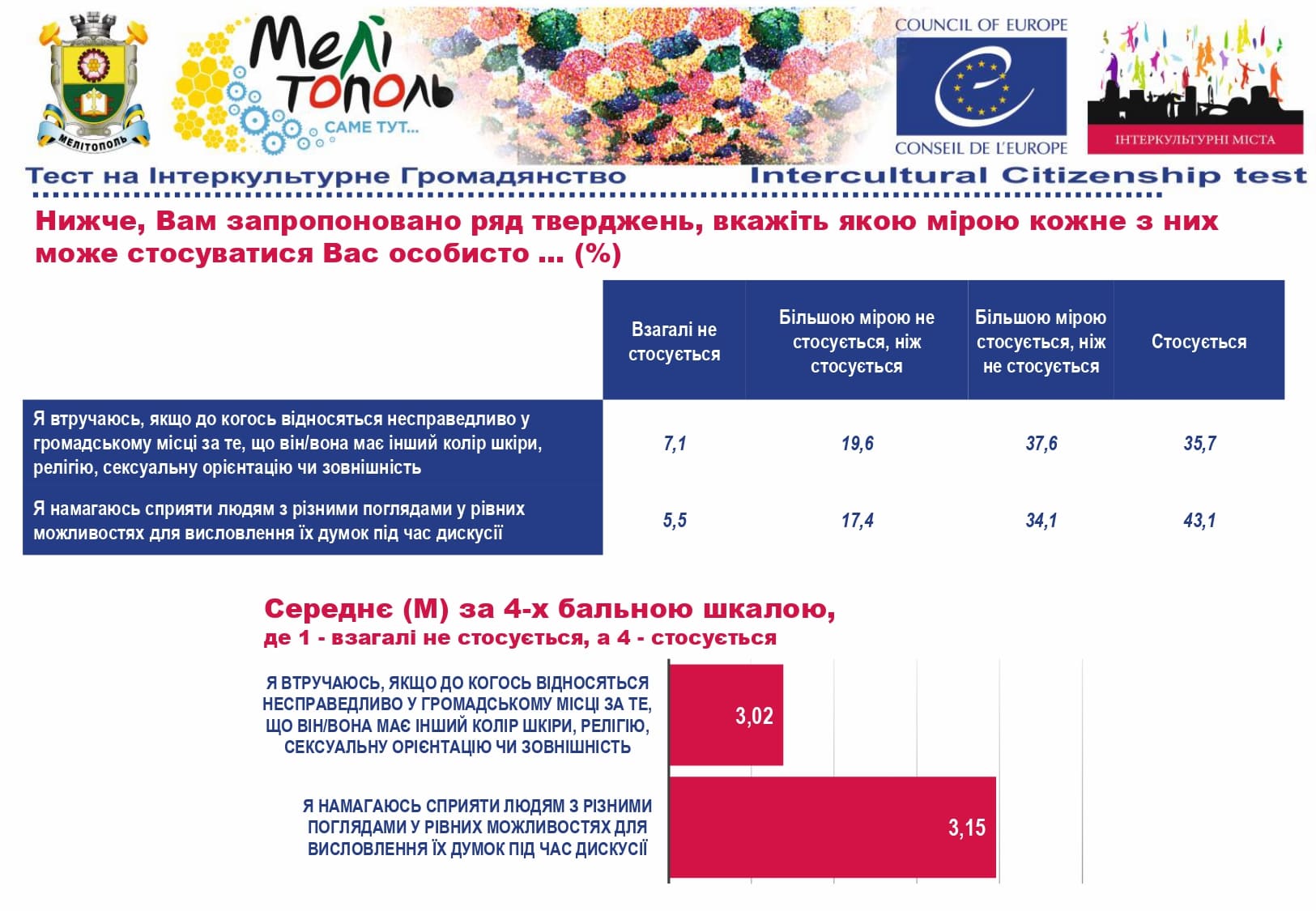 У рамках реалізації проєкту «Боротьба з чутками» за підтримки Програми «Інтеркультурні Міста» (ІСС) Ради Європи (РЄ), за методикою експерта з ІСС політики РЄ Др. Ксенії Рубікондо й у співпраці з Центром соціологічних досліджень Мелітопольського державного педагогічного університету, з 11 червня по 2 липня 2021 року, проводилося опитування жителів учасників Української Мережі Інтеркультурних Міст (ІСС-Україна) – Вінниця, Луцьк, Мелітополь, Павлоград, Одеса, Суми – з ціллю класифікації існуючих чуток та упереджень, що стосуються культурного різноманіття.