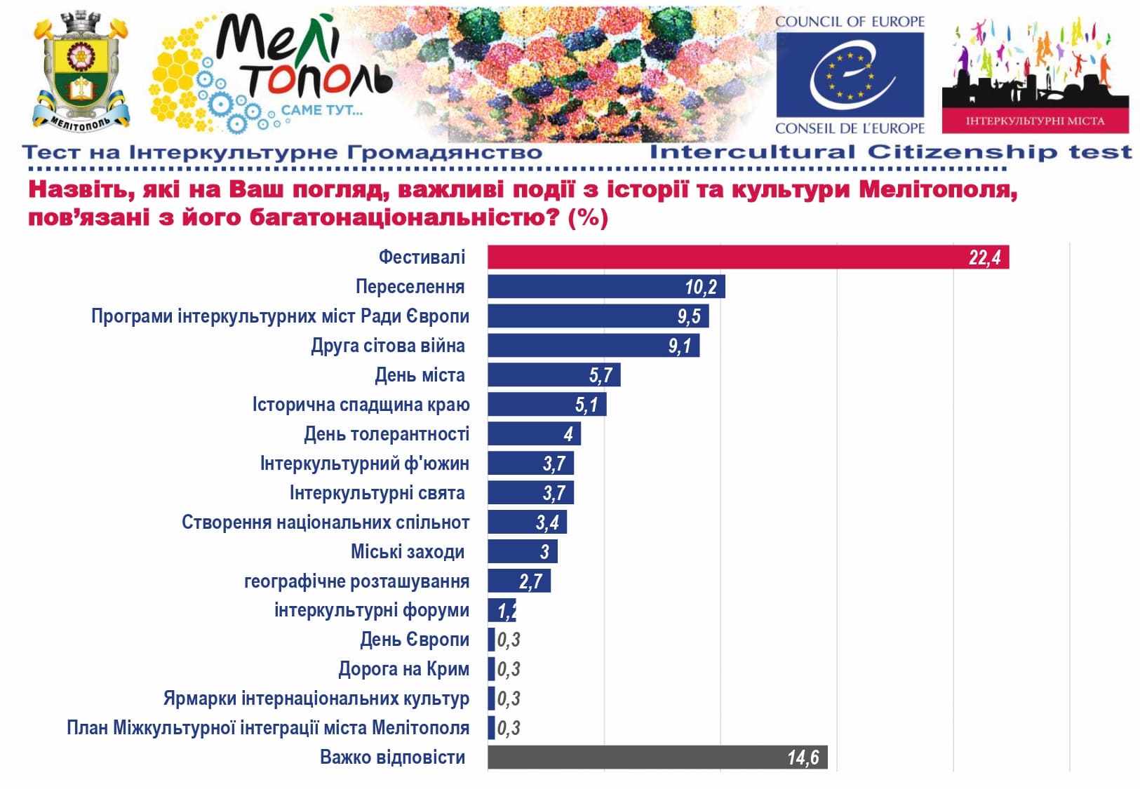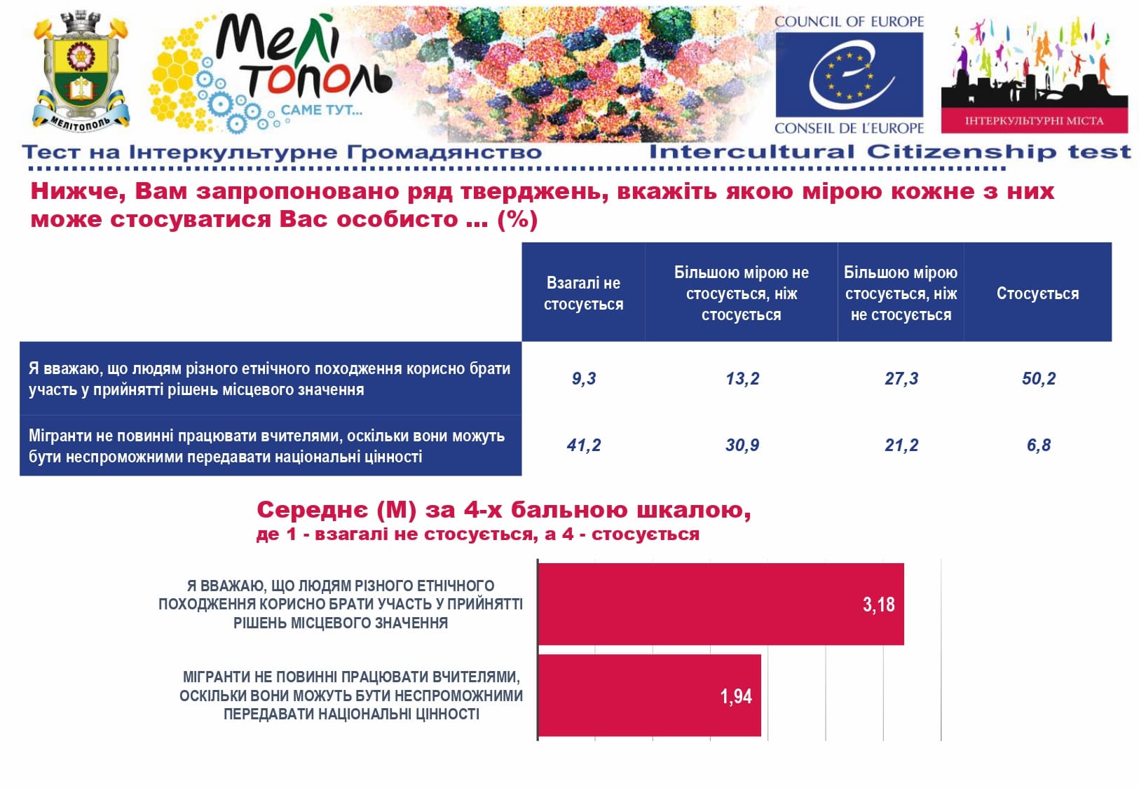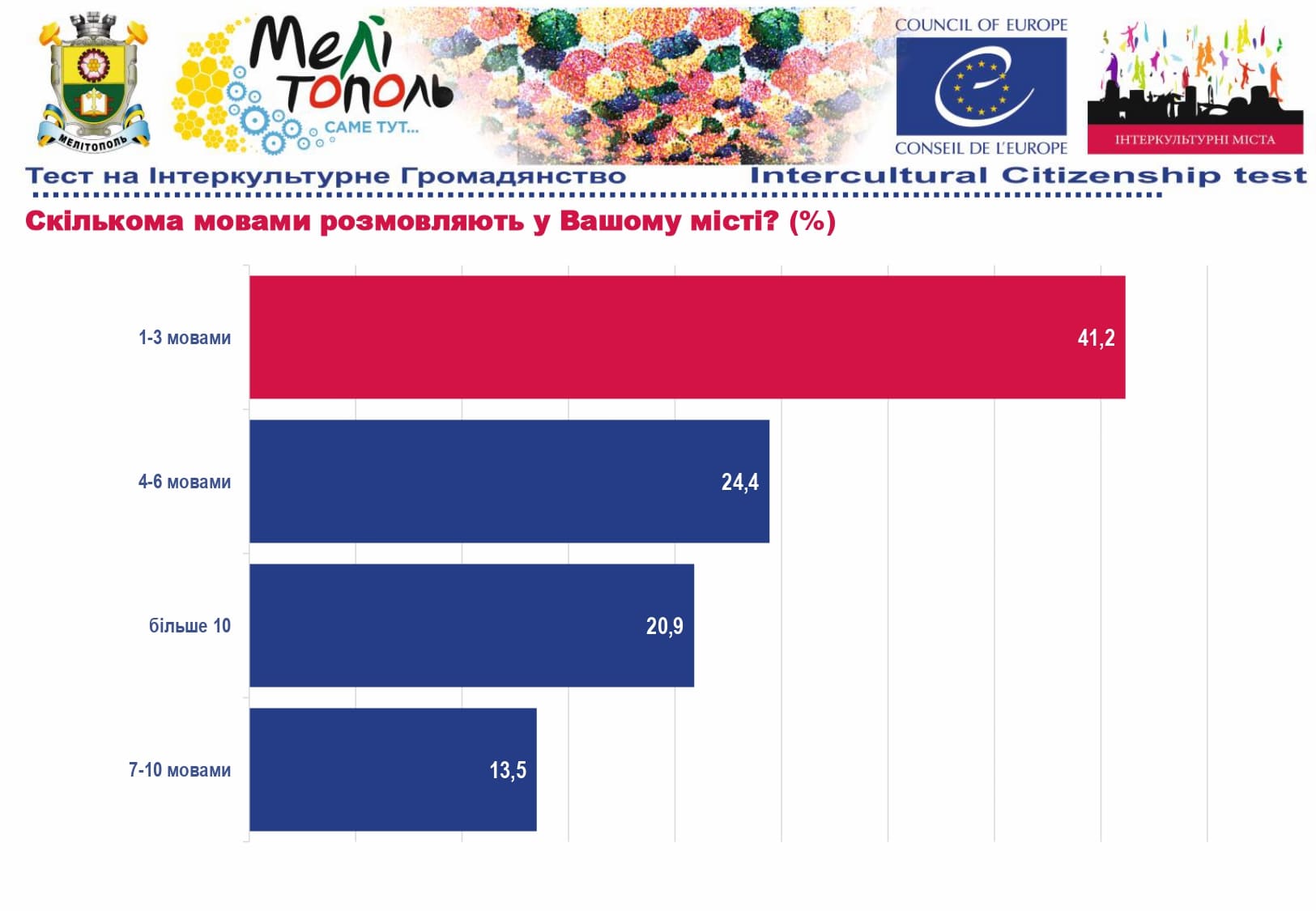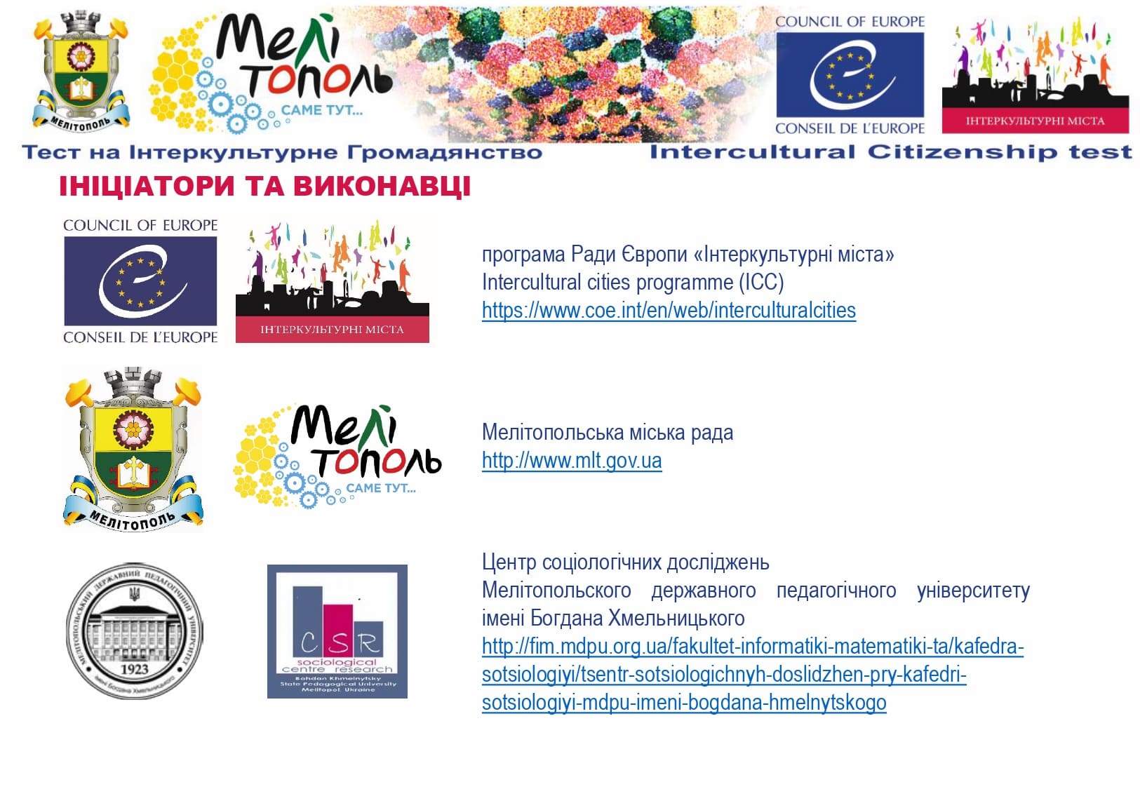 У рамках реалізації проєкту «Боротьба з чутками» за підтримки Програми «Інтеркультурні Міста» (ІСС) Ради Європи (РЄ), за методикою експерта з ІСС політики РЄ Др. Ксенії Рубікондо й у співпраці з Центром соціологічних досліджень Мелітопольського державного педагогічного університету, з 11 червня по 2 липня 2021 року, проводилося опитування жителів учасників Української Мережі Інтеркультурних Міст (ІСС-Україна) – Вінниця, Луцьк, Мелітополь, Павлоград, Одеса, Суми – з ціллю класифікації існуючих чуток та упереджень, що стосуються культурного різноманіття.