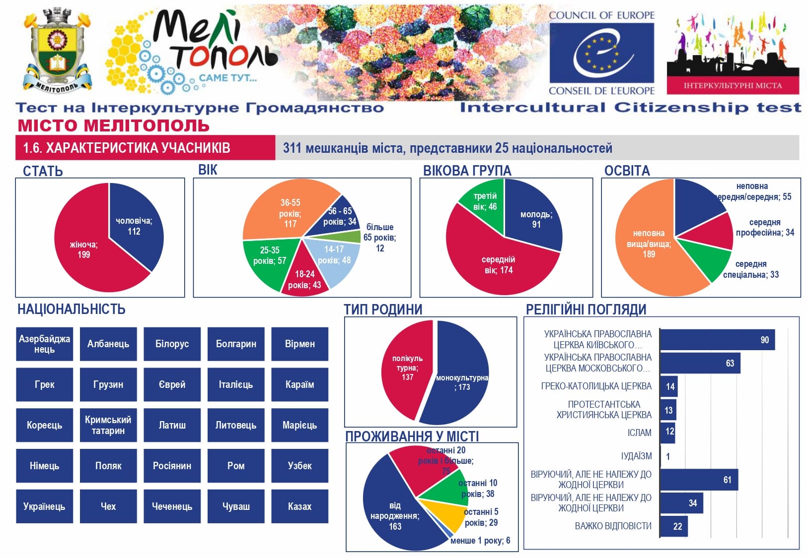 Вибірка дослідження. В опитуванні взяли участь 124 мешканців міст Української Мережі Інтеркультурних Міст (ІСС-Україна) учасників Проєкту. Вікові характеристики: 16-22 роки (9,8%), 23-29 роки (8,9%), 30-39 роки (31,7%), 40-49 років (27,6%), 50-59 років (15,4%), 60 років і старше (6,5%). За сферою діяльності: працівники освіти – 24%, державні службовці – 21%, студенти – 17%, керівники підприємств/організацій/структурних підрозділів – 14%, громадських організацій – 7%, представники малого бізнесу – 7%, представники релігійних конфесій – 5%, вимушено переселені особи – 5%, представники етнічних спільнот – 4%, медичні працівники – 2%, мігранти – 1%. (ПЕРЕГЛЯНУТИ)