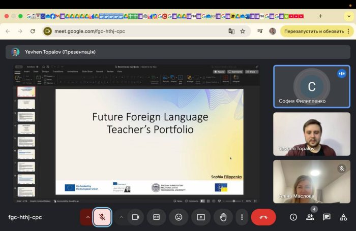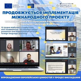 👩🏼💼📝 На конференції здобувачі вищої освіти, які залучені до міжнародного проєкту, а саме академічні групи 111/1-сг, 111/2-сг, 211-сг, 711-сг факультету суспільно-гуманітарних наук та права, представляли власні портфоліо (Portfolio with a compulsory section “How I promote EU common values through my teaching”), які вони збирали протягом всього циклу опанування Модуля.