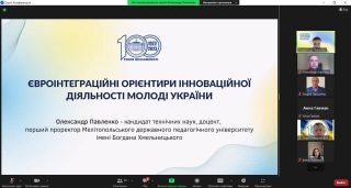 Кандидат технічних наук, доцент, перший проректор Мелітопольського державного педагогічного університету імені Богдана Хмельницького Павленко О.М. розкрив питання Євроінтеграційних орієнтирів інноваційної діяльності молоді України.