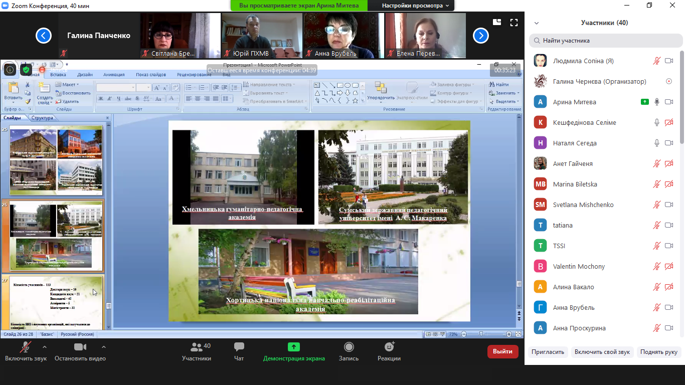 З вітальним словом до учасників конференції звернулись Москальова Л.Ю. – проректор з наукової роботи Мелітопольського державного педагогічного університету імені Богдана Хмельницького; Федорова О.В. – директор Навчально-наукового інституту соціально-педагогічної та мистецької освіти Мелітопольського державного педагогічного університету імені Богдана Хмельницького; Гузій Н.В. – доктор педагогічних наук, професор кафедри теоретичної та консультативної психології Національного педагогічного університет у імені М.П.Драгоманова; Матвєєва О.О. – доктор педагогічних наук, професор кафедри музично-інструментальної підготовки вчителя Харківського національного педагогічного університету імені Г.С.Сковороди.