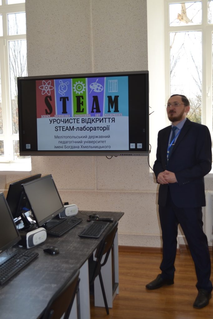 Ректор Солоненко А.М. зазначив, що на ремонт і обладнання STEAM-лабораторії було витрачено сотні тисяч гривень і вона має на меті організацію проектно-орієнтованої, науково-орієнтованої та науково-технічної діяльності здобувачів освіти та науково-педагогічних працівників з використанням інноваційних методик та високотехнологічних засобів навчання.