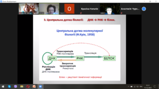 Досить детально старший викладач кафедри Ольга Анатоліївна Прокоф’єва розповіла про центральну догму біології: ДНК – РНК – білок та унікальність властивостей ДНК.