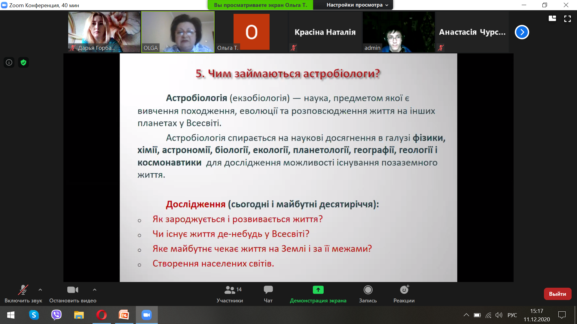 Походження життя на Землі хвилювало людей з давнини. Це одна з найскладніших проблем у біології. Наразі існує багато теорій виникнення житті. У ході вебінару були розглянуті: гіпотеза Опаріна-Холдейна про виникнення в океані живого з неживого. Теорія панспермії стверджує, що життя могло виникнути при падінні метеоритів і комет, які несуть на собі «попередники живого – насіння», що падало на Землю. Гіпотеза РНК-світу полягає у припущенні, що попередниками живих клітин були молекули РНК, що шляхом самовідтворення еволюціонували до складніших клітинних утворень. Є гіпотеза про теоретичну можливість альтернативної біохімії на основі базових хімічних елементів, здатних утворювати достатньо складні хімічні сполуки. Ці питання розкрила асистент кафедри Дар’я Горбань.