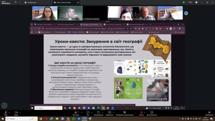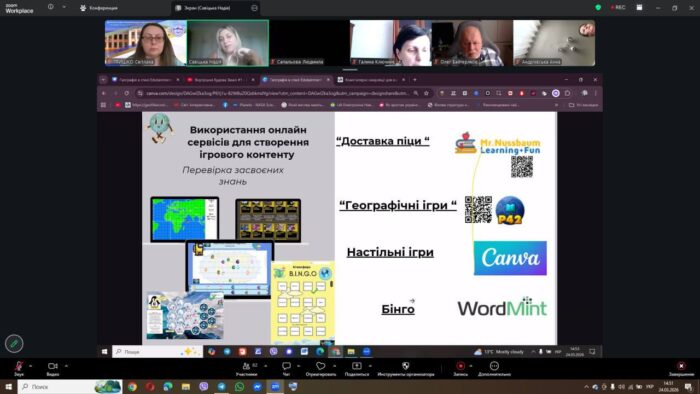 🛠️ У межах вебінару розглянуто практичні інструменти та методики, які сприяють підвищенню ефективності уроків географії, зокрема використання елементів гри, інтерактивних завдань, дослідницької діяльності та роботи з реальними кейсами. Надія Петрівна запропонувала добірку інструментів, які допоможуть перетворити звичайне опитування на захопливу гру, а саме: Spin the Wheel (Випадкове колесо), Genially (Гра «Хто я?»), Wordwall (Знайдіть пару), PurposeGames (Відповідності); сервіси, які допомагають у вивченні нового матеріалу: Educaplay, Classtools.net, UCAR, CIMSS, Gizmos, Padlet; сервіси для перевірки засвоєних знань: Mr. Nussbaum Learning+Fun, P42 (PurposeGames), Canva, WordMint.
