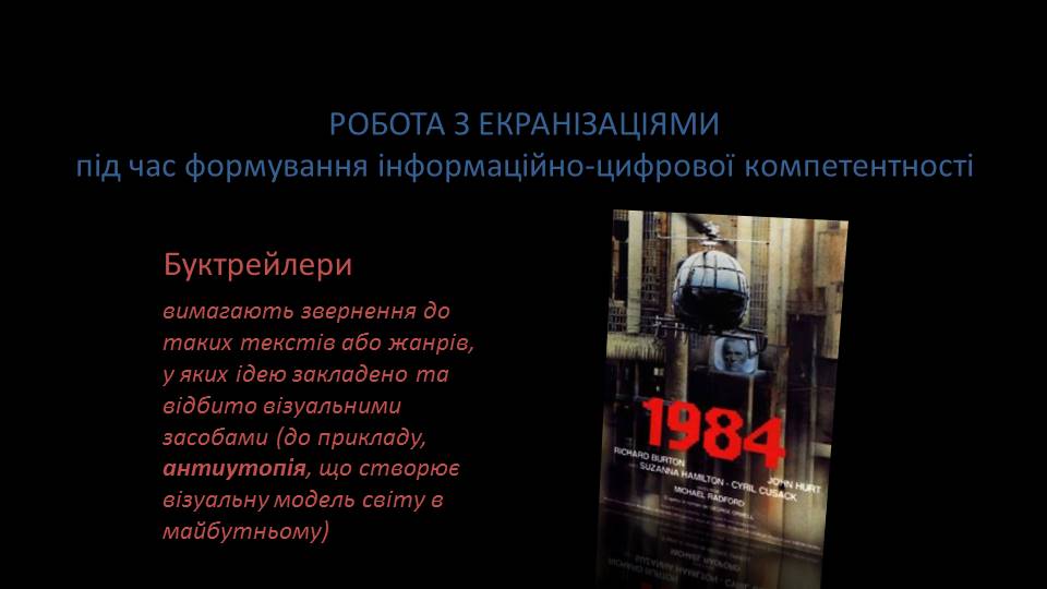 Візуальна культура нині стала нашою реальністю, яка вимагає змін у підходах до викладання (у тому числі – й предметів гуманітарного циклу). Художня література – особливий вид мистецтва, що вельми специфічно пов’язаний із зоровим сприйманням людиною дійсності. Цю специфіку часто не помічає сучасне діджитал-покоління учнів, а педагоги – оминають цю дидактичну проблему. Утім актуальні наукові розвідки в царині інтермедіальних досліджень надають необхідний теоретичний інструментарій для практичного подолання цього бар’єру.