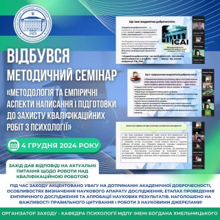 🏛️🚀4 грудня 2024 року кафедра психології МДПУ імені Богдана Хмельницького організувала та провела методичний семінар на тему «Методологія та емпіричні аспекти написання і підготовки до захисту кваліфікаційних робіт з психології».
