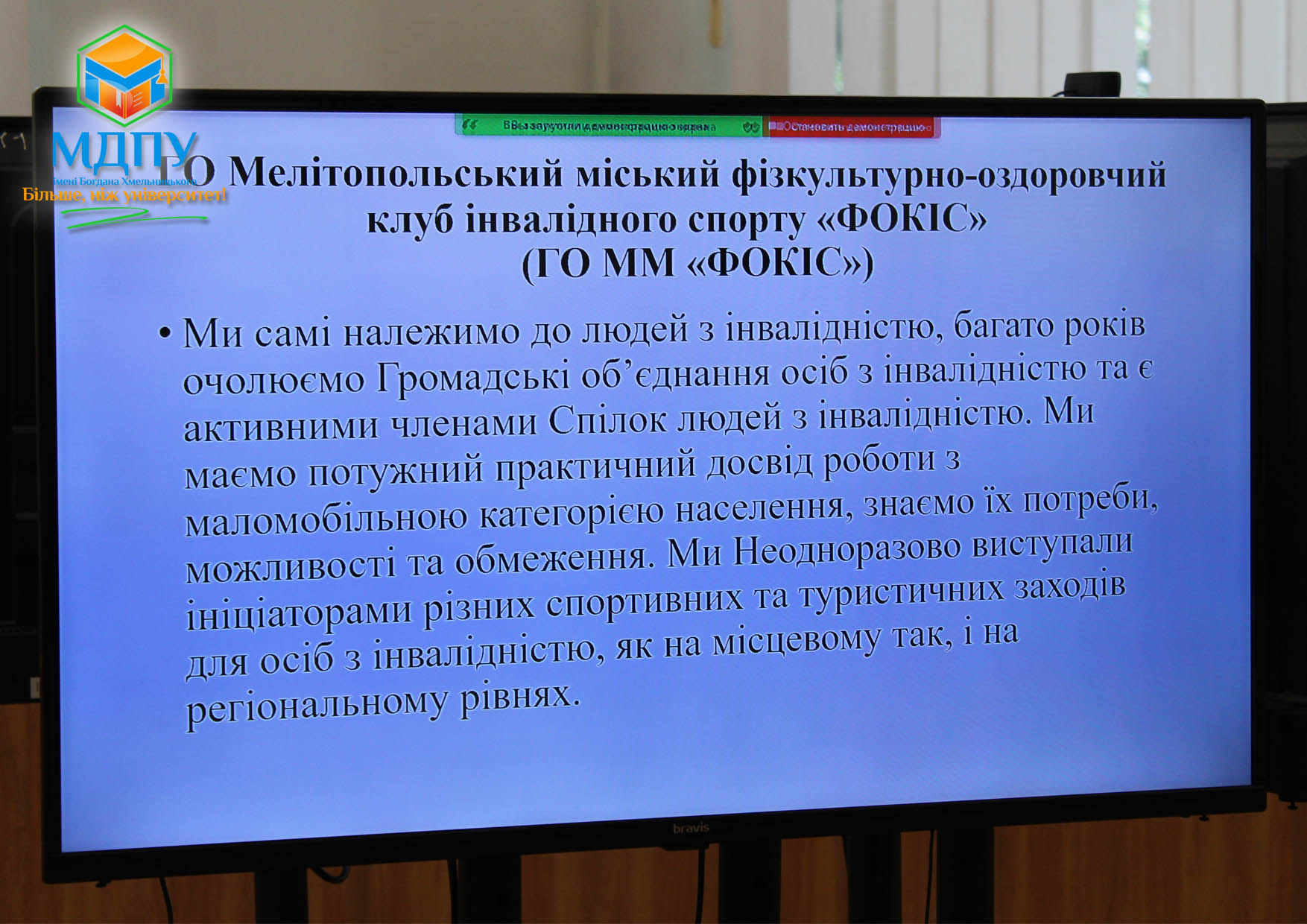 – Сьогодні наш університет є не тільки партнером проекту, а й виступає гарантом якості щодо наукового та практичного обґрунтування визначеної проблематики. Адже, саме наші спеціалісти першими в Україні дослідили та дали визначення феномену «Адаптивний туризм», що підтверджено рядом монографій та навчальних посібників, – підкреслив Анатолій Миколайович. – Саме нашими фахівцями в галузі «адаптивного скелелазіння» були проведені перші в Україні спортивні заходи та фестивалі адаптивного скелелазіння. Вже багато років МДПУ виступає організатором та співорганізатором міських спортивних заходів для людей з інвалідністю разом із Мелітопольським міським фізично-оздоровчим клубом інвалідного спорту «Фокіс».