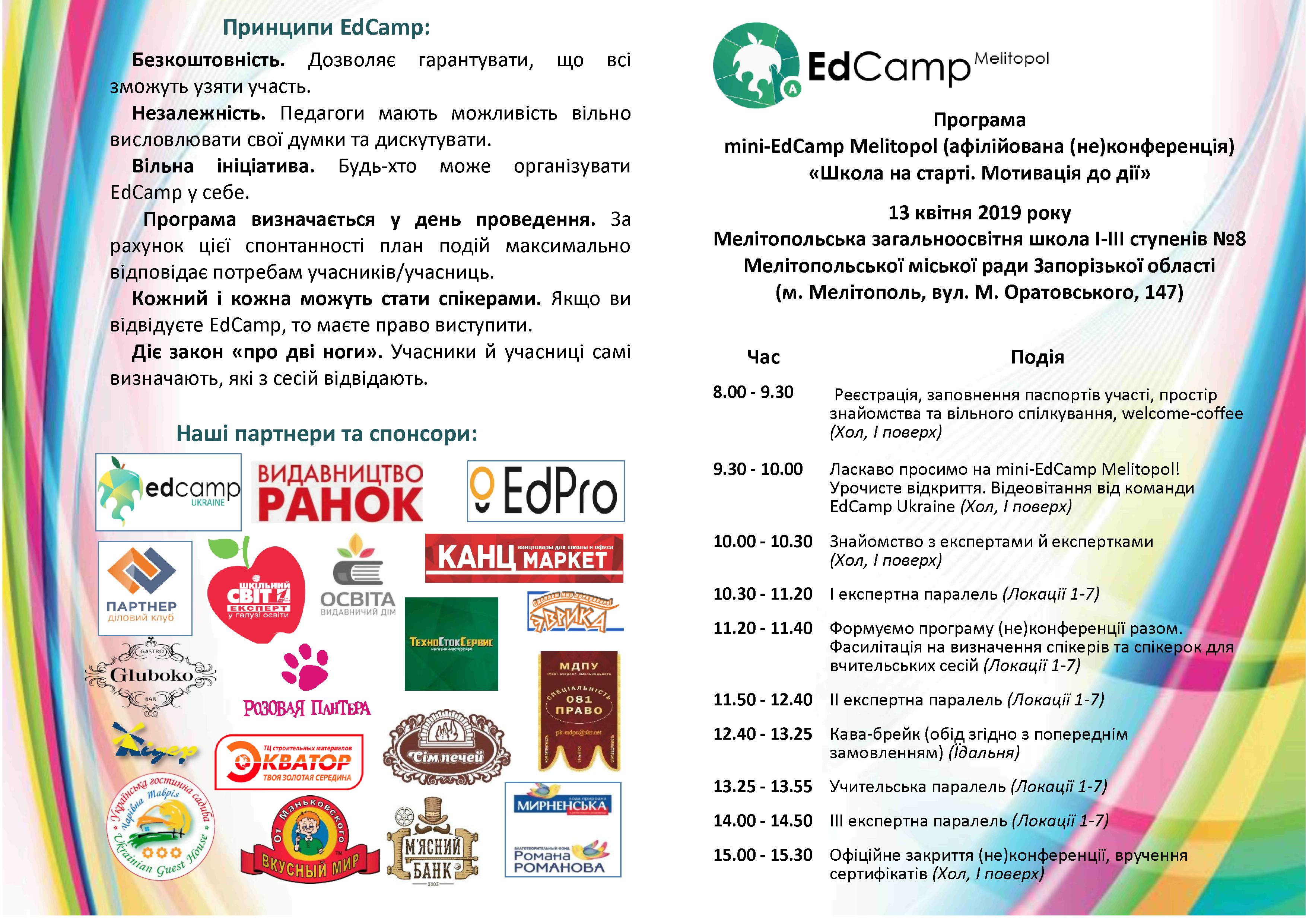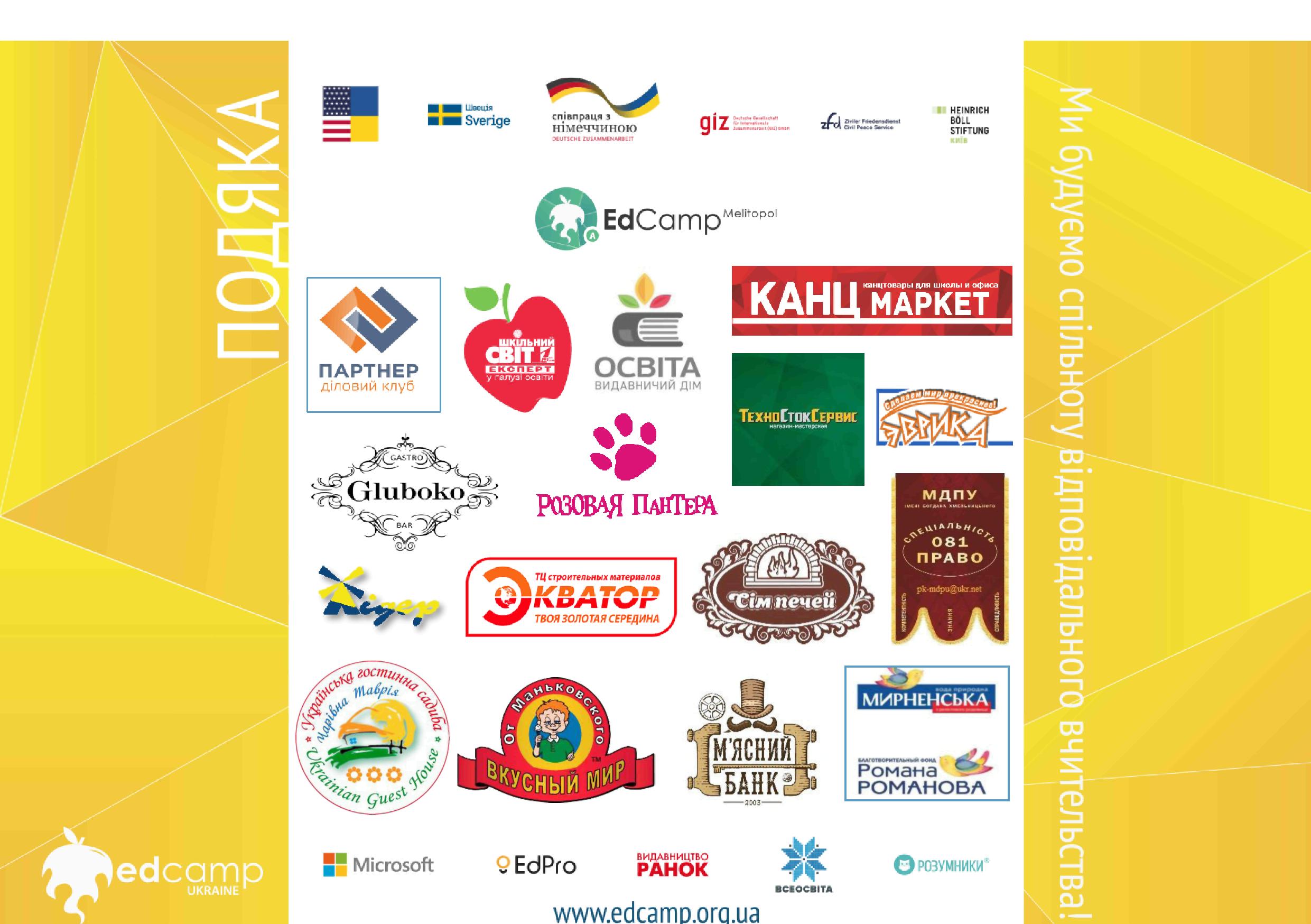 Формат EdCamp є шостим у світовому рейтингу найбільш інноваційних освітніх організацій. EdCamp Ukraine – це спільнота відповідального вчительства, яка на відміну від неефективної системи сучасної освіти пропонує інноваційну модель професійного зростання вчительства, мотивує педагогів на реалізацію реформи в освіті. Завідувач кафедри права МДПУ імені Богдана Хмельницького В. Гапотій провів ряд зустрічей з вчителями мелітопольського регіону, батьками майбутніх абітурієнтів. В результаті партнерства та участі в заході назва, логотип кафедри права та контакти розміщені на всіх рекламних продуктах, програмі та сертифікату, що дає можливість більш детально ознайомитись зацікавлених осіб в Україні про нашу спеціальність, умови вступу та навчання за спеціальністю 081 Право.