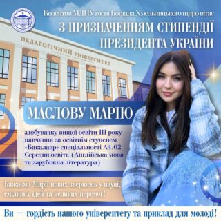 🎓✨ Колектив Незламного МДПУ імені Богдана Хмельницького щиро радіє досягненню нашої здобувачки вищої освіти ІІІ курсу бакалаврату, спеціальності А4.02 Середня освіта (Англійська мова та зарубіжна література) факультету суспільно-гуманітарних наук та права – МАСЛОВОЇ МАРІЇ!