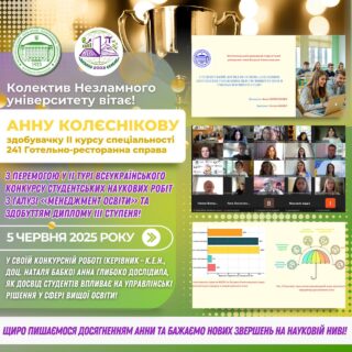 🙋🏻♀️🏆Студентка 2 курсу спеціальності 241 Готельно-ресторанна справа МДПУ імені Богдана Хмельницького Анна Колєснікова, гідно представила наш заклад у ІІ турі Всеукраїнського конкурсу студентських наукових робіт з галузі «Менеджмент освіти», що відбувся 5 червня 2025 року на базі Глухівського національного педагогічного університету імені Олександра Довженка.