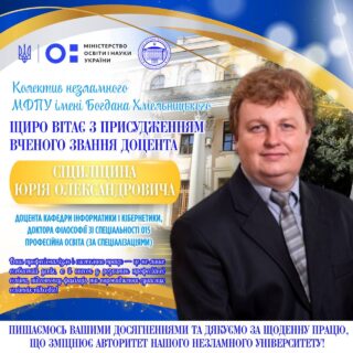 👨🏼‍🎓👏🏻 Колектив Мелітопольського державного педагогічного університету імені Богдана Хмельницького щиро вітає Сіциліцина Юрія Олександровича, доцента кафедри інформатики і кібернетики, із важливою подією у професійній кар’єрі — присвоєнням вченого звання доцента.