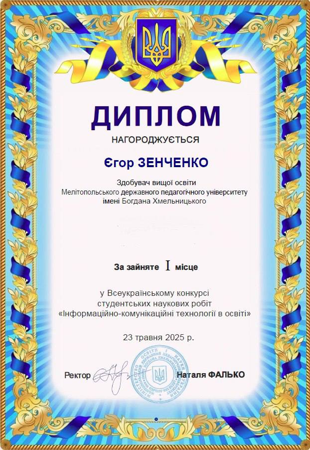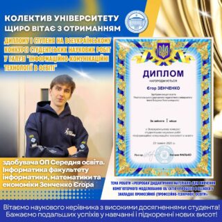 🙋🏻‍♂️🥳Щиро вітаємо здобувача освітньої програми “Середня освіта. Інформатика” Зенченка Єгора з отриманням Диплому І ступеня у II турі Всеукраїнського конкурсу студентських наукових робіт у галузі “Інформаційно-комунікаційні технології в освіті”!
