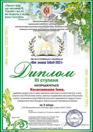 Здобувачка ступеня вищої освіти «магістр» Колесникова Інна (науковий керівник – доцент кафедри дошкільної освіти і соціальної роботи Єрмак Ганна Володимирівна) була нагороджена дипломом ІІІ ступеня.